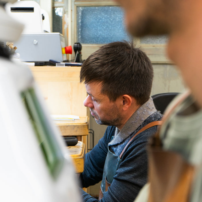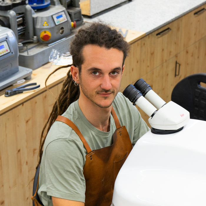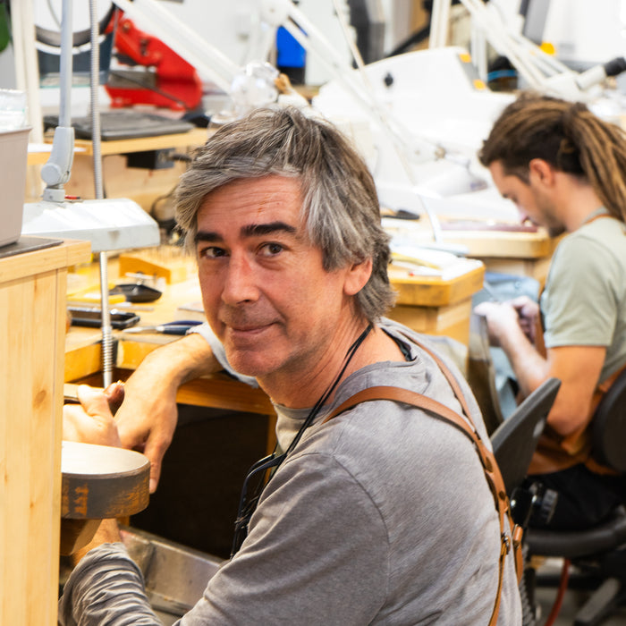 En Francesc és expert clavador, un ofici que li ve de família. Gràcies a ell, la seva traça i paciència, Roosik and Co ha introduït diferents tècniques de clavat ancestral en les teves joies amb diamants, com el grafilat o el perfilat. Són una meravella.