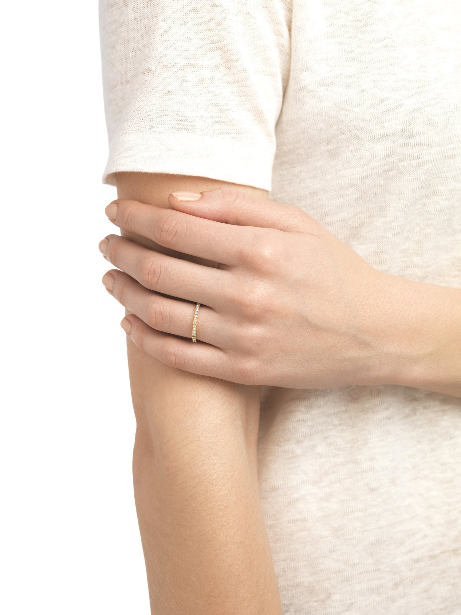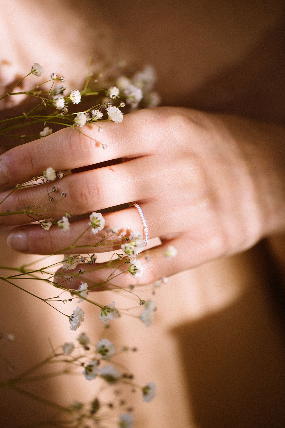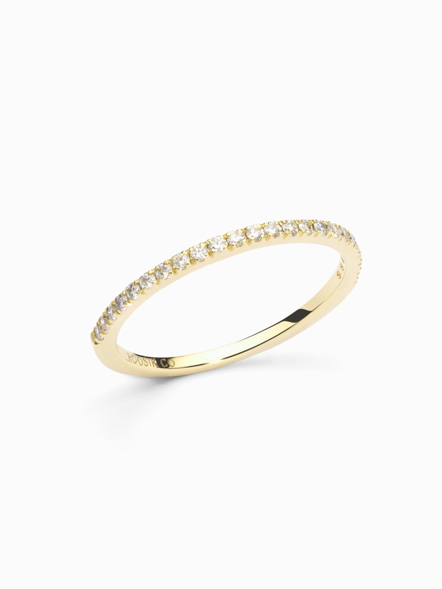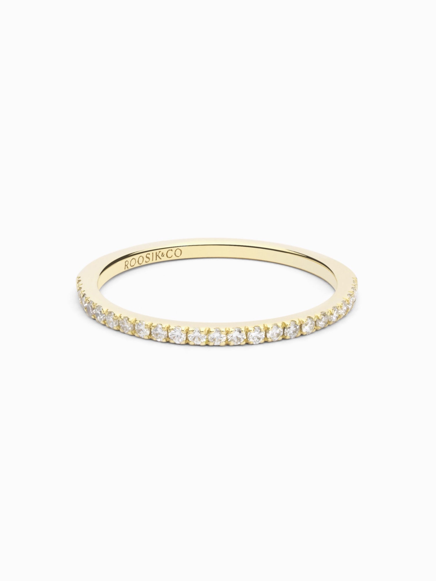 Una successió de 25 diamants que sumen 0,18 quirats fan d’aquest anell de la col·lecció Eternal de Roosik&Co una peça que és discreta però molt rica alhora. L’harmonia entre el color de l’or groc, la llum dels brillants -la triple excel·lència de les pedres garanteix la reflexió del 99% de la llum- i la cadència amb què es disposen les pedres sobre la part superior de l’anell composen un conjunt que acaba destacant per l’elegància final. Una joia perfecte per a expressar els sentiments més profunds.