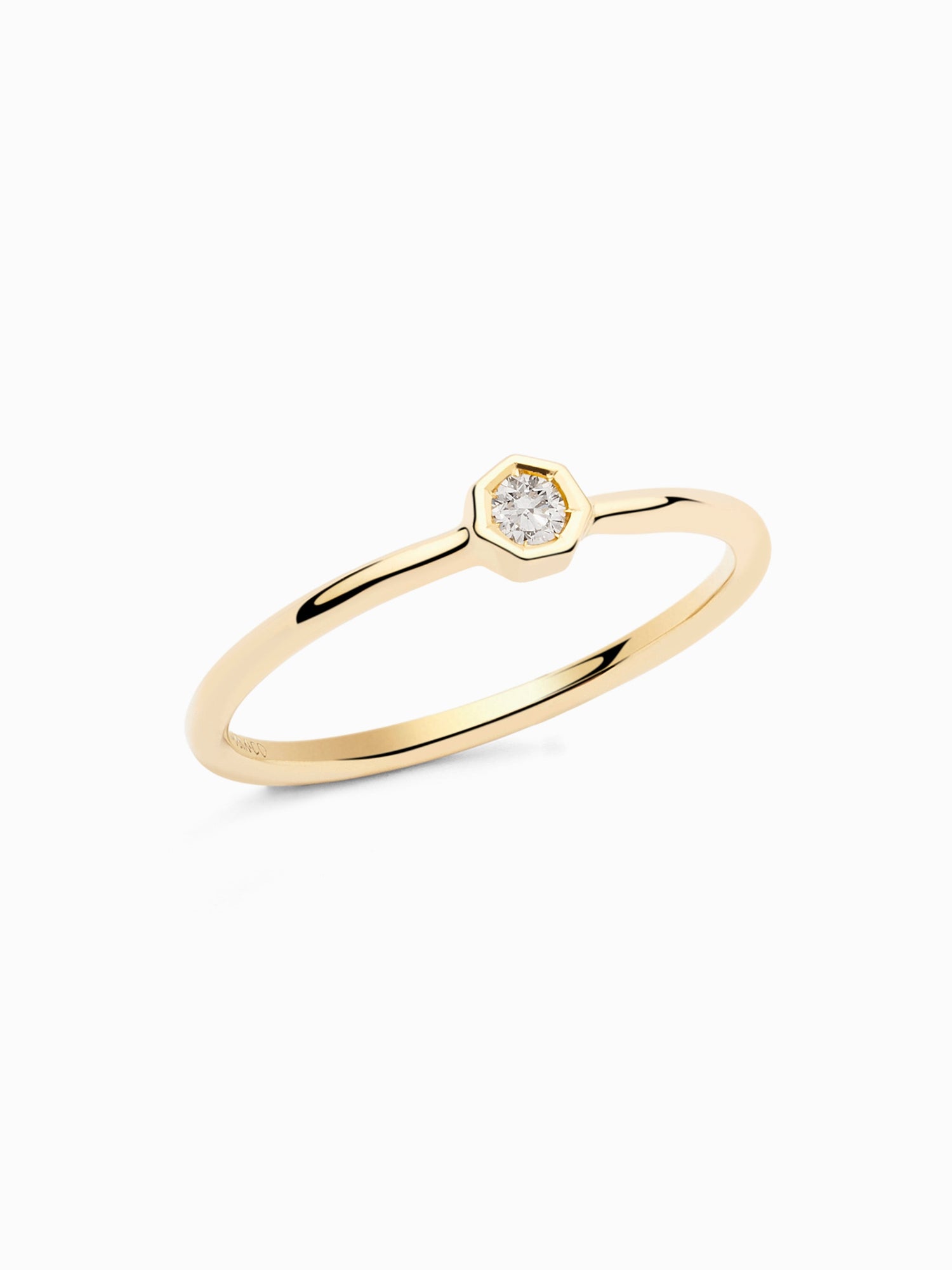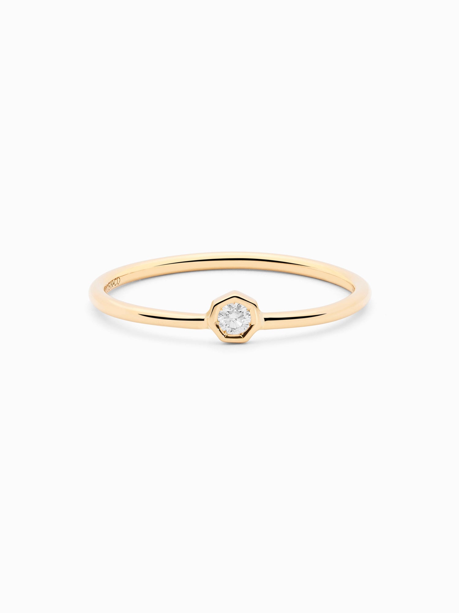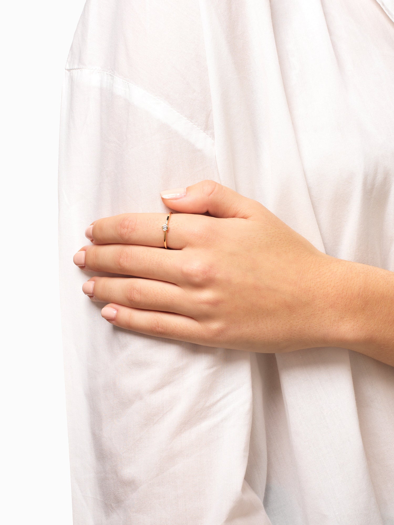 Aquest anell d’or amb diamant té un aire minimalista i delicat especialment pensat per a donar molt de joc. La subtilesa d’aquesta joia tan portable aportarà un toc de lluminositat a qualsevol look. Al mateix temps, la seva forma i acabat és perfecte per a combinar-se amb altres anells de la mateixa sèrie amb diferents gemmes de colors: robí, maragda, aiguamarina safir rosa, safir groc i safir blau.