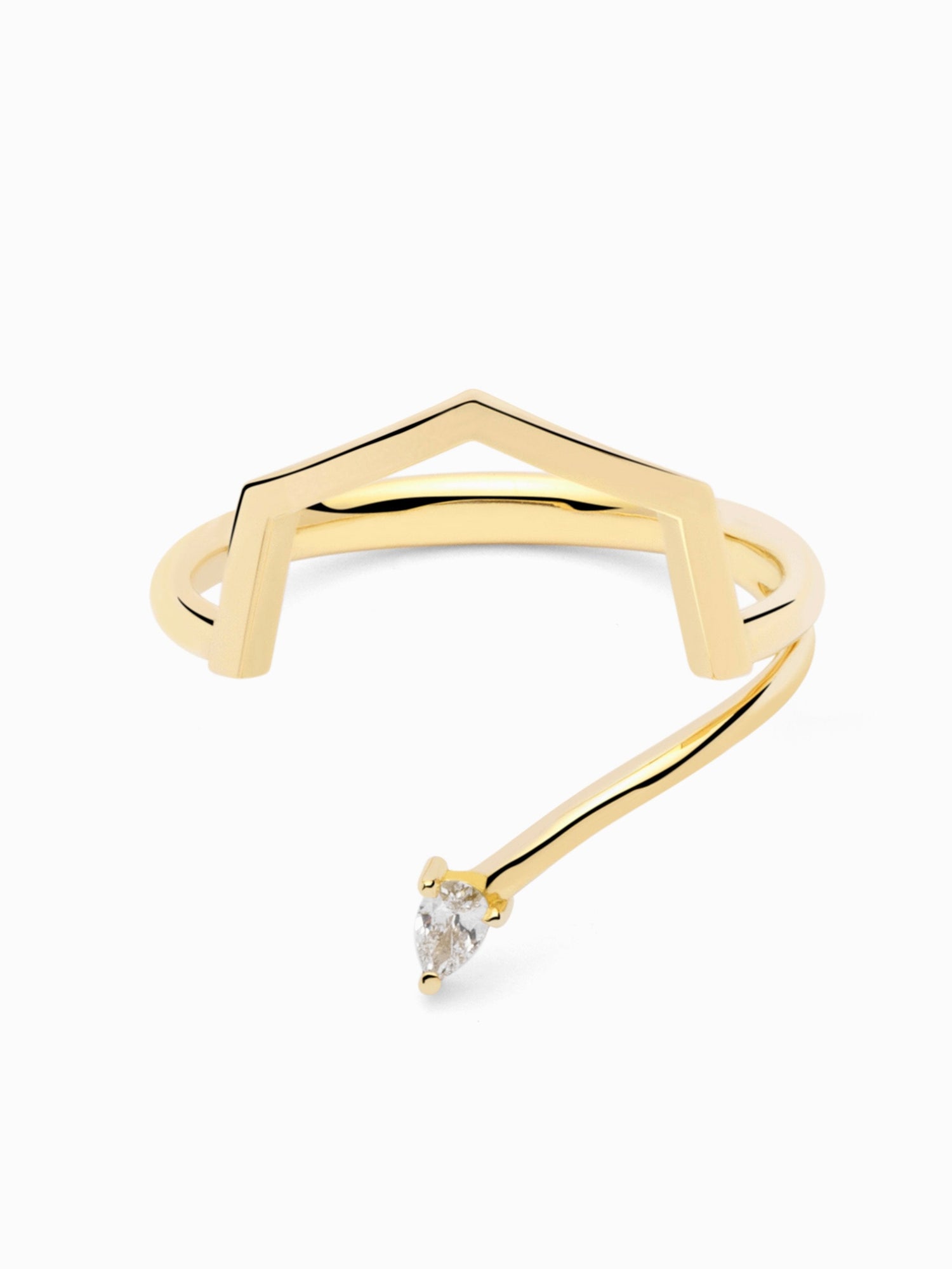 En aquest anell d'or groc, en Jordi Rosich ha jugat amb el contrast de la banda sinuosa d'or groc en forma d'heptàgon i amb un diamant en talla pera. Una joia elegant i sofisticada que garanteix una bona impressió si fas un regal.