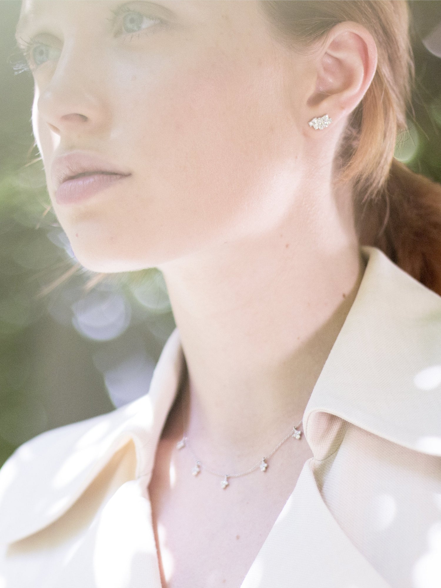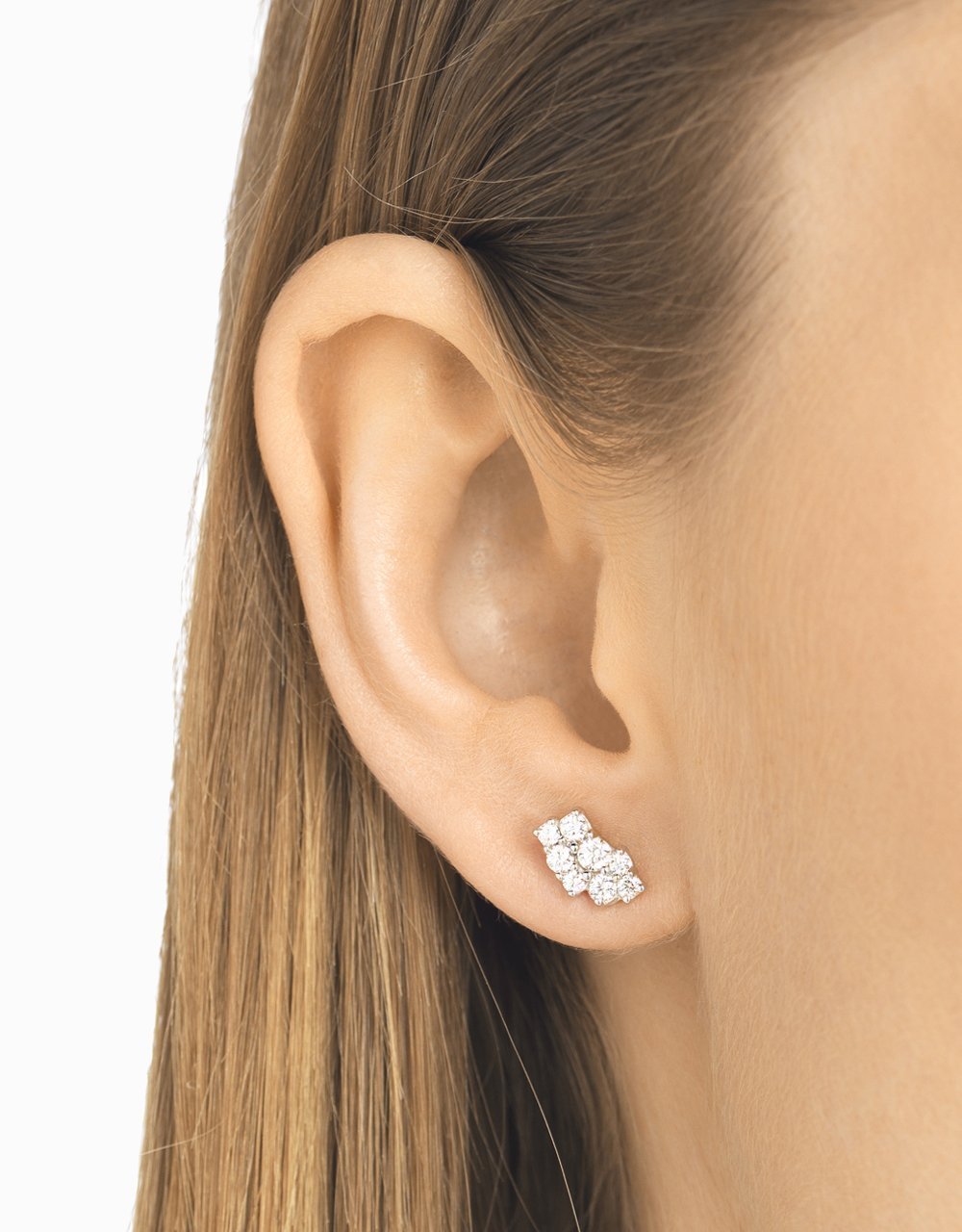 El motiu Bunch que ha creat Jordi Rosich per a les col·leccions de Roosik&Co. pren forma d’arracada en aquesta peça de la col·lecció Eternal. Presentat aquest cop exclusivament amb diamants, una composició de vuit pedres seleccionades curosament pel mateix Jordi Rosich s’ordenen de forma arbitrària, formant un penjoll que irradia tota la llum i la bellesa dels diamants. Una joia creada per vestir i realçar qualsevol look, però especialment pensada per a ocasions formals i de compromís per l’extrema elegància discreta que aporten.