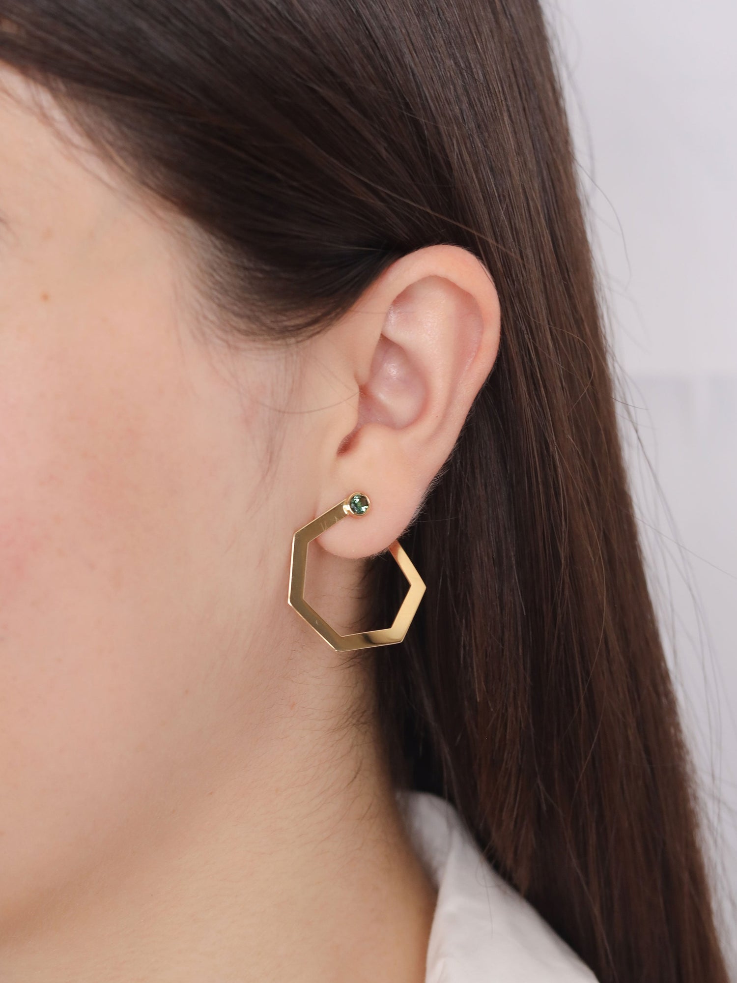 Heptasik és la col·lecció més contemporània de Jordi Rosich. En aquesta col·lecció, l’heptàgon icònic de la marca Roosik&Co. esdevé protagonista, com en aquestes arracades criolles, en què l’argolla pròpia del concepte és substituïda per un heptàgon en or groc. Una idea trencadora que posa de relleu la capacitat creativa del disseny de Rosich. El detall final li posa la turmalina verda que tanca la criolla amb un punt de color al botó. Unes arracades per a una dona atrevida i amb un gran sentit de l’estètica contemporània.