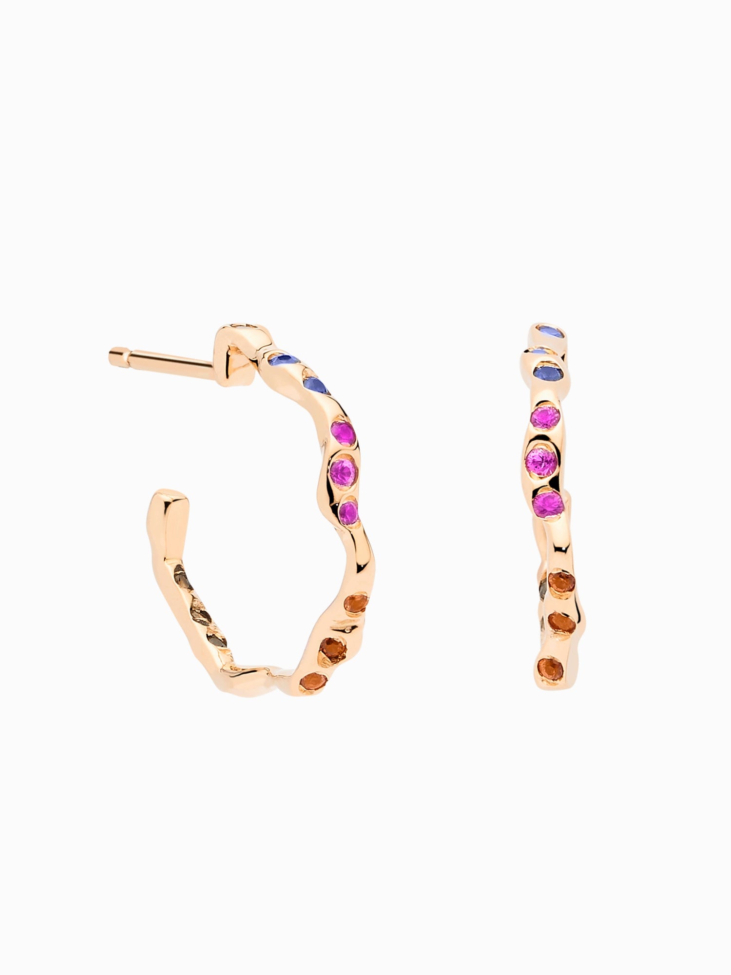 Un jardí de safirs a les teves orelles. Els safirs més populars són els blaus, però Jordi Rosich és un gran amant de les gemmes de colors més rares de trobar en la natura: com els safirs verds, grocs o roses. Imagina't doncs, com d'especials i alegres són aquetes arracades d'aro en or groc, blanc o rosa i amb safirs de tots els colors. També t'encantarà l'anell a conjunt, fes-li un cop d'ull :)