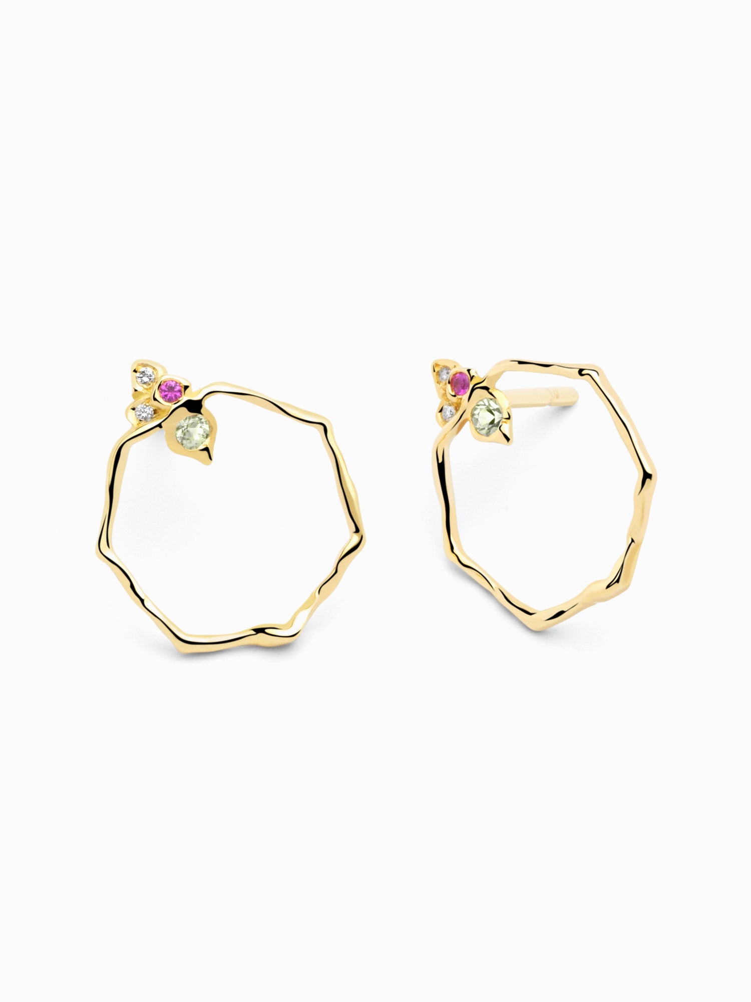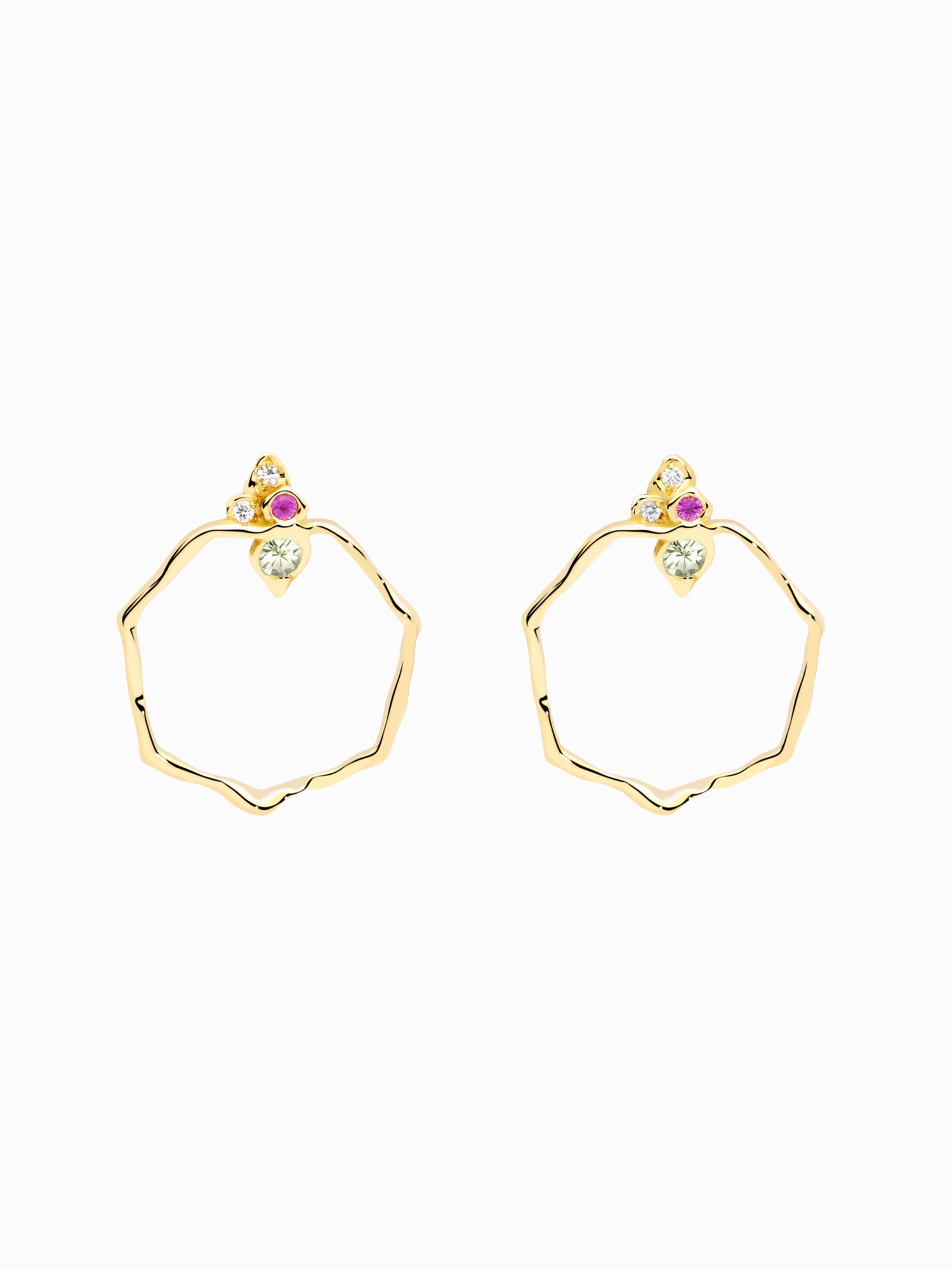 Unes arracades d'aro originals i de tamany mitjà que donaran un punt de llum a la teva mirada. T'encantarà la composició de pedres precioses que les acompanya: dos safirs roses, dos safirs verds i quatre diamants capaços de reflectir el 100% de la llum que hi entra. Combina-les amb el penjoll, la polsera o l'anell Sapphire Garden a conjunt.
