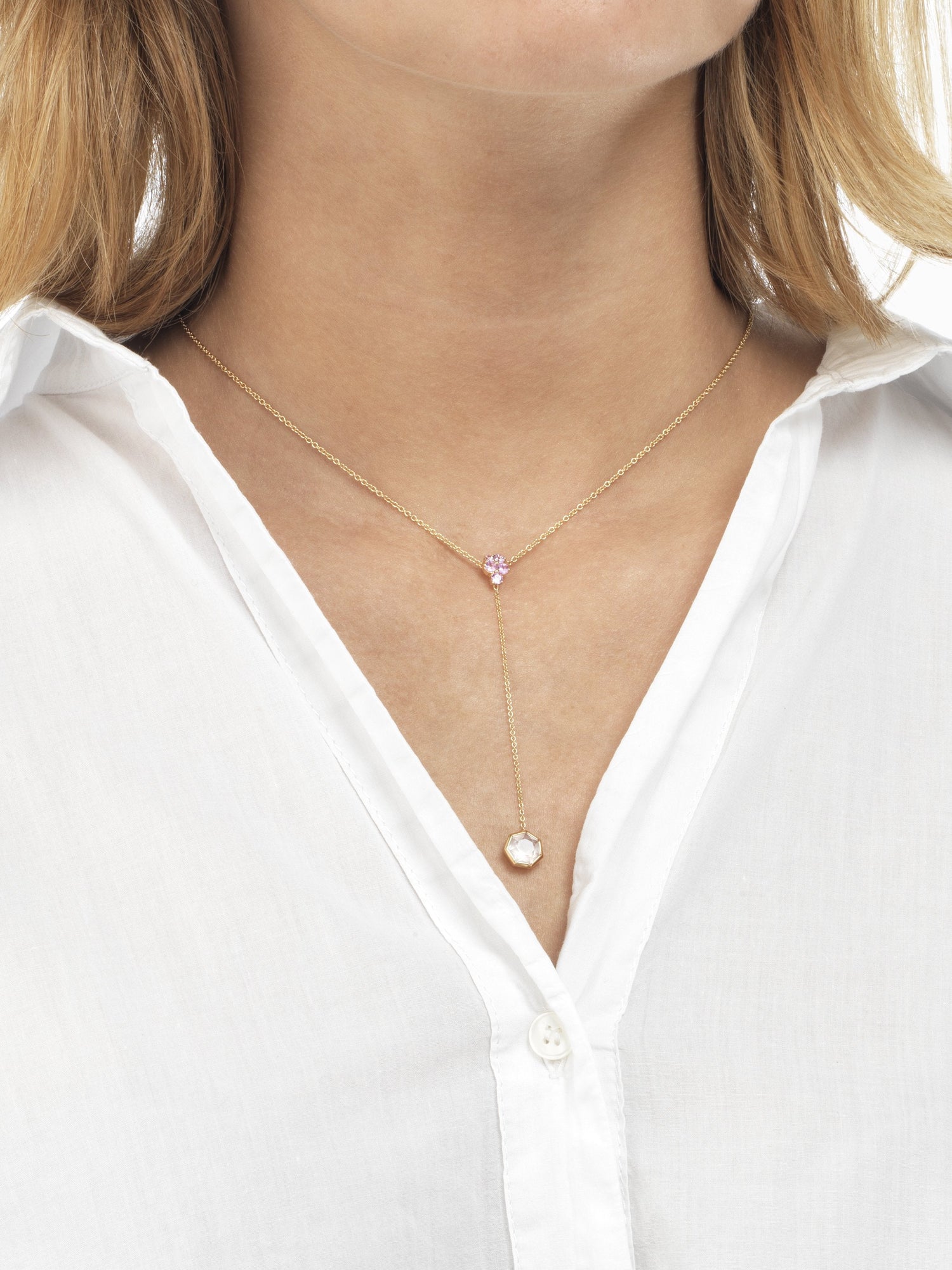 Un penjoll d’un contrast únic i bell, gràcies a la combinació de pedres precioses que Jordi Rosich -joier, clavador, gemmòleg i dissenyador de Roosik&Co- realitza amb especial cura. En aquesta joia uneix 1 Quars Rosa amb 5 Safirs, també roses. Els safirs roses són pedres precioses molt especials, a causa de la seva raresa en la natura. Per la seva banda, el Quars Rosa es presenta en talla heptagonal, exclusiva de Roosik & Co, fet que aporta una reflexió de la llum única i molt bella a aquesta gemma. Aquesta joia s’ofereix també en d’altres combinacions d’or i amb pedres precioses de tons blaus (topazi i safir blau) com el verds (peridot i tsavorites) i taronges (citrí i safir grocs).
