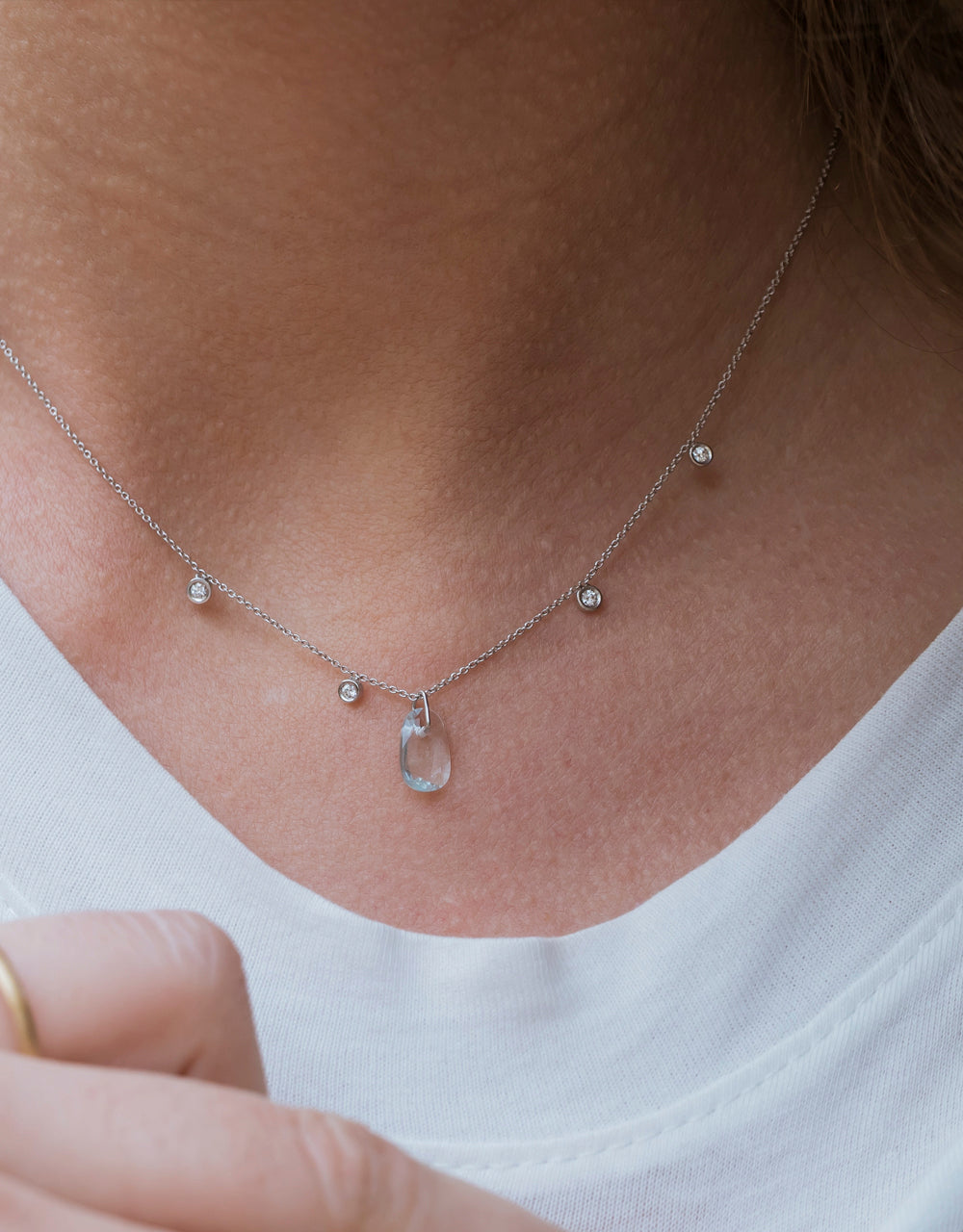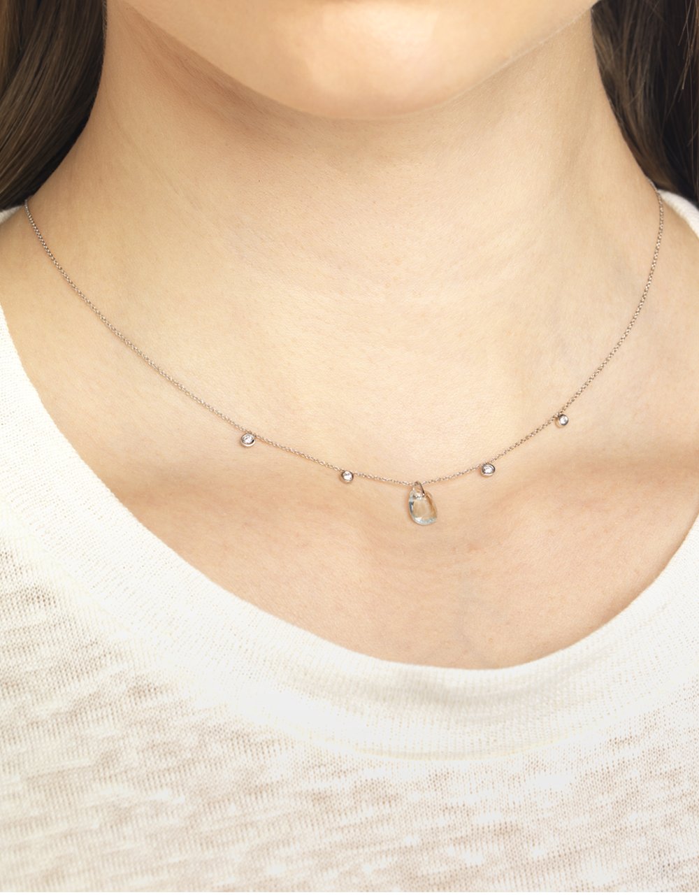La proposta de disseny de penjoll Blossom Slender de Roosik&Co. es planteja en aquesta ocasió en una combinació d’or blanc, aiguamarina i diamants amb talla brillant. El color d’argent de l’or blanc combina perfectament amb la lluminositat dels diamants, que es disposen en parelles a banda i banda de la pedra central, una aiguamarina. L’or blanc li dóna a aquest collaret un aire molt elegant i alhora discret, per bé que el seu original disseny ressalta i dóna vida a l’escot d’una dona actual, que sap apreciar els complements de qualitat.
