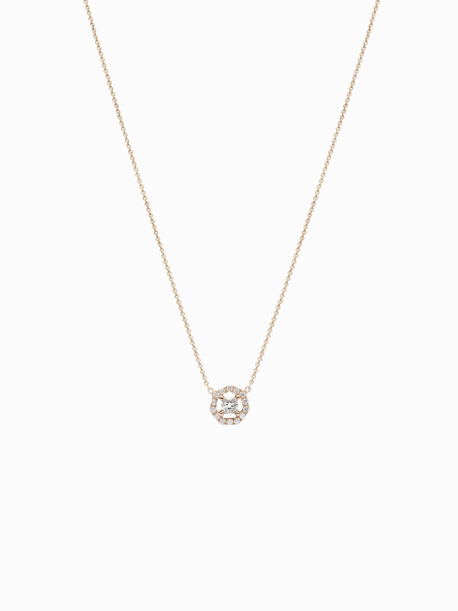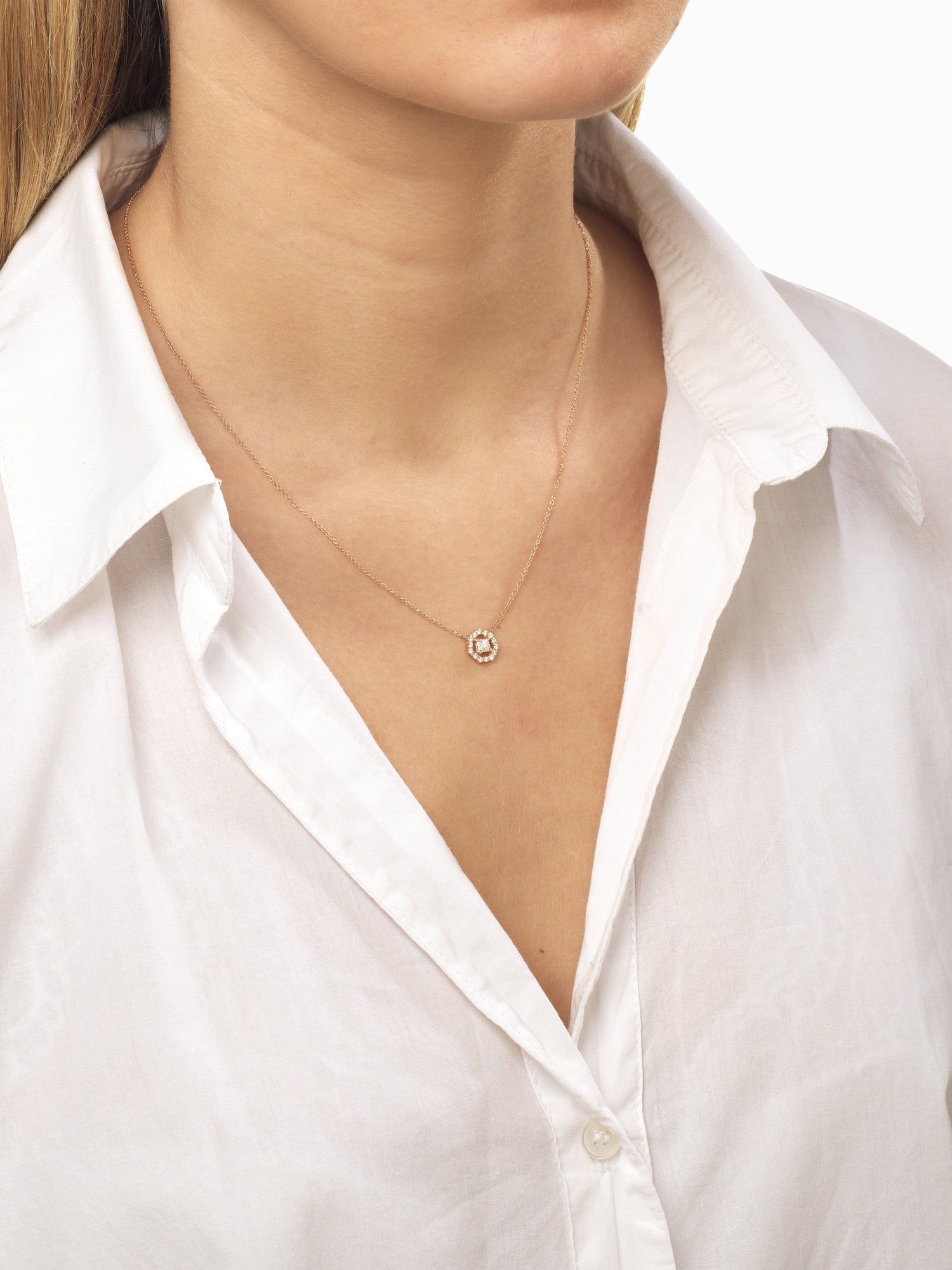 Un total de 14 diamants formen en aquestes penjoll la característica composició heptagonal que és la icona inconfusible de la marca Roosik&Co. L’heptàgon abraça un diamant en talla princesa de 0,20 quirats certificat per Jordi Rosich. En aquesta ocasió, Rosich ha treballat amb l’or rosa i els diamants per aportar feminitat i romanticisme a un disseny del tot actual, que forma un conjunt perfecte amb la polsera, l’anell i les arracades Vitruvik d’or rosa amb motiu heptàgon i diamant.