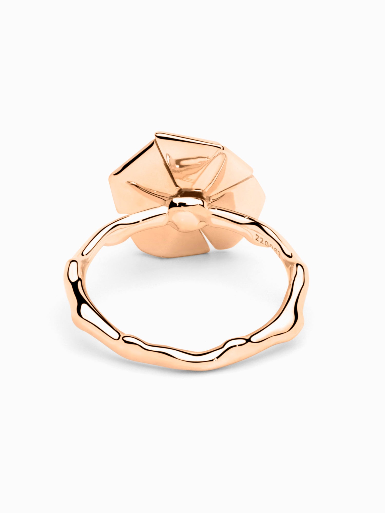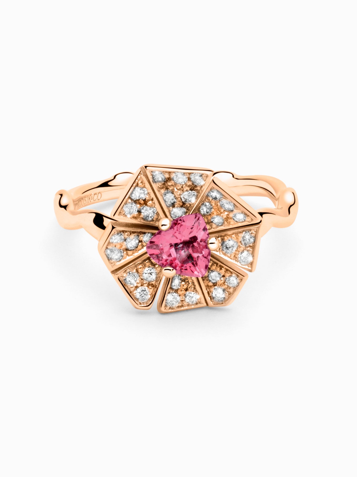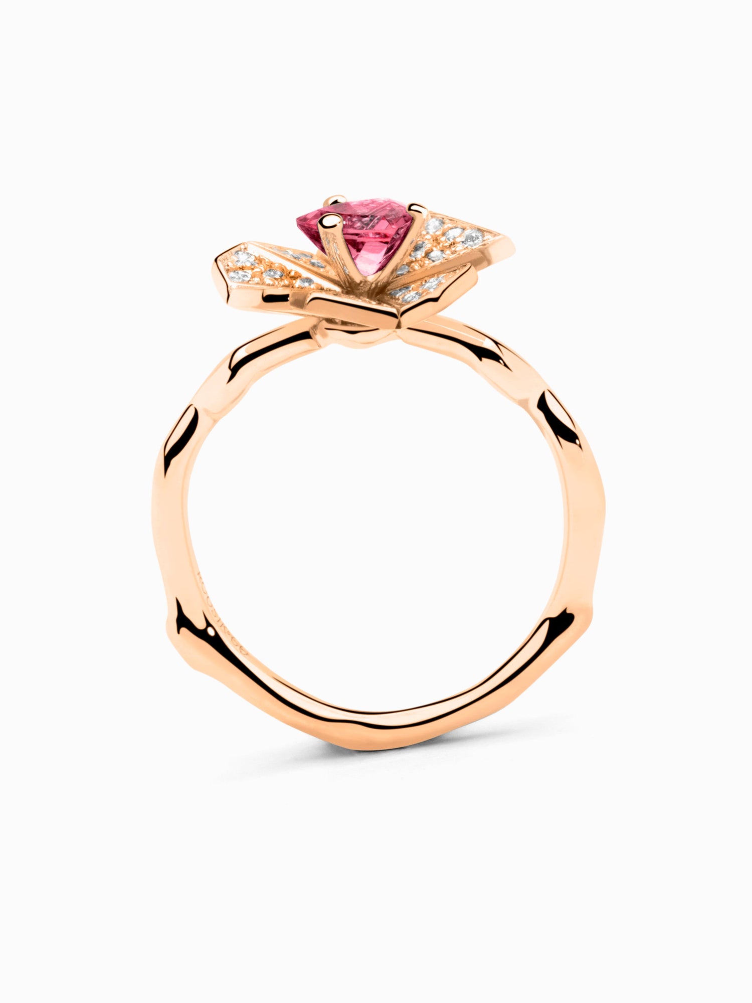What if love was a flower? A ring of organic shapes in rose gold and with a pink tourmaline can express nothing more than the joy, complicity and romanticism of the most beautiful of emotions: the love that blooms when spring arrives! In the petals, 35 brilliant-cut, triple-excellence diamonds give light and contrast to the beautiful colored gemstone that shines in the center in the trillion (triangular) cut.