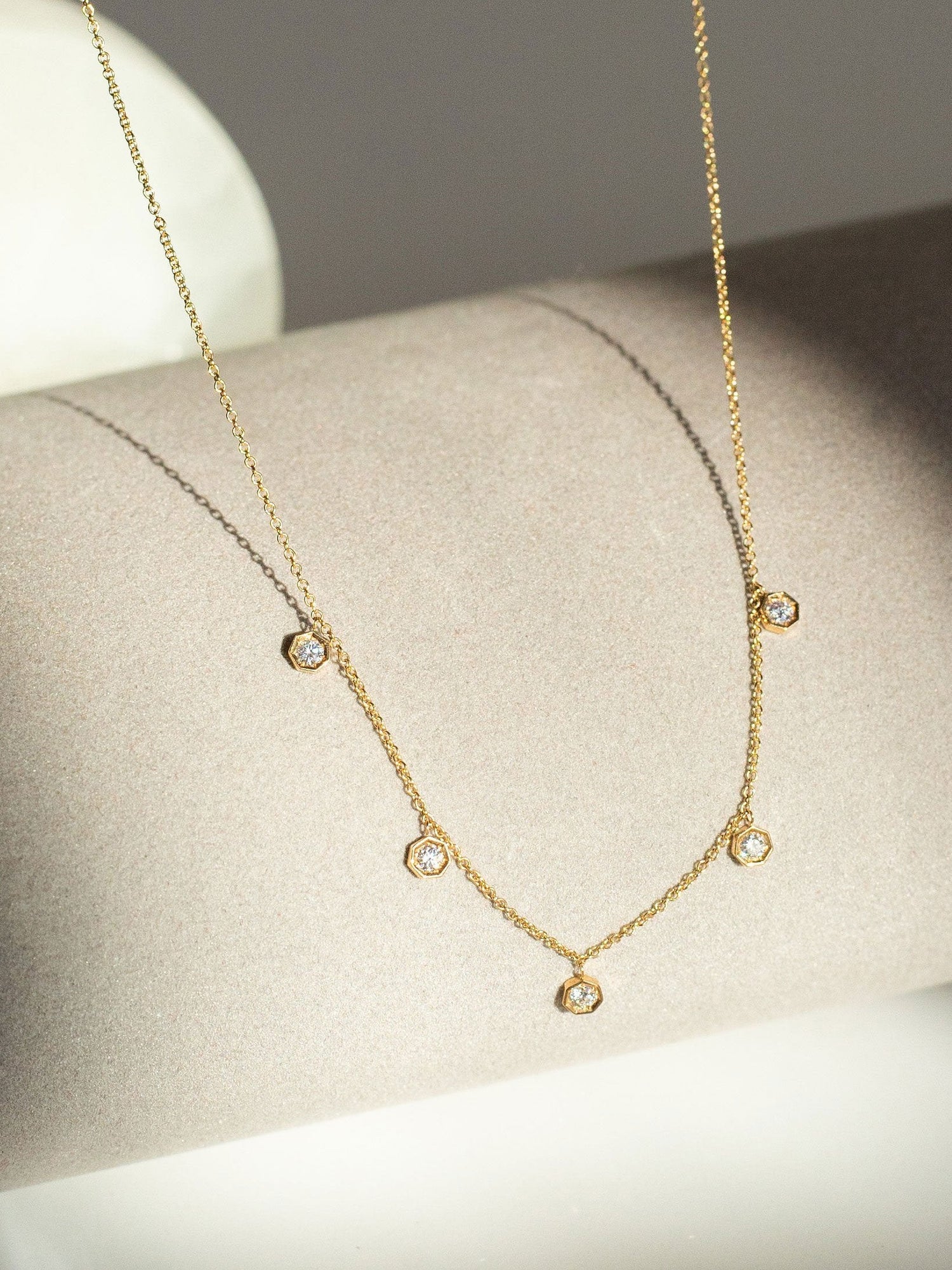 In this pendant, five diamonds of great beauty and brightness are wrapped around the gold heptagons, the iconic figure of Roosik & Co. A subtle and original piece of jewelery to wear every day and at the same time be worthy of the most special occasions. It is worked with 1, 3 and 5 heptagons and is offered with other precious stones: ruby, emerald, aquamarine, pink sapphire, yellow sapphire and blue sapphire. Jordi Rosich has also designed the bracelets and rings of the same series to make a beautiful set.