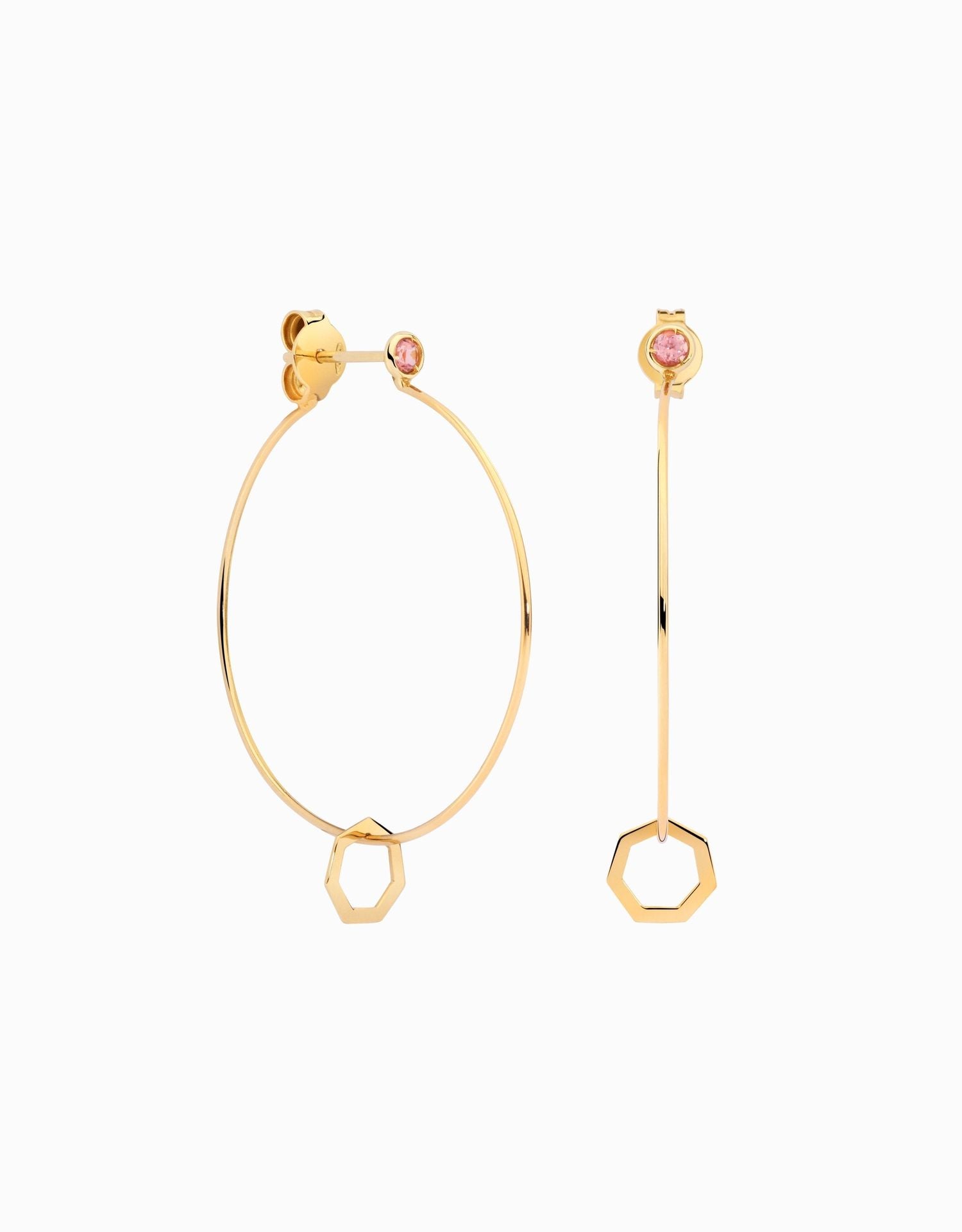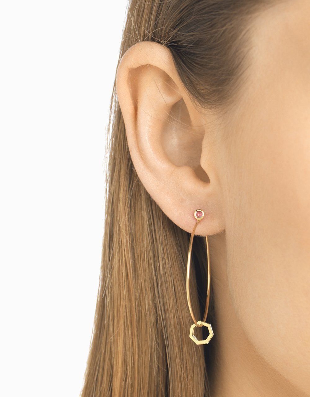 In these yellow gold creole earrings, a small heptagon hangs from the hoop. This geometric figure, protagonist of the Heptasik collection by Roosik & Co, becomes the focus of attention of this jewel and brings it movement and dynamism. At the opposite end, a small precious stone, a pink tourmaline in the area of ​​the button marks the counterpoint with the heptagon, and gives it a point of brightness. Jordi Rosich includes a safety fence in these creoles to wear them with complete freedom.