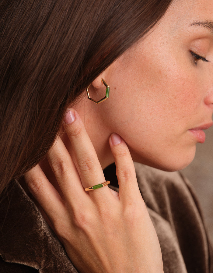 The thin band of polished 18k yellow gold subtly embraces the stone, creating a discreet but personality-filled piece.