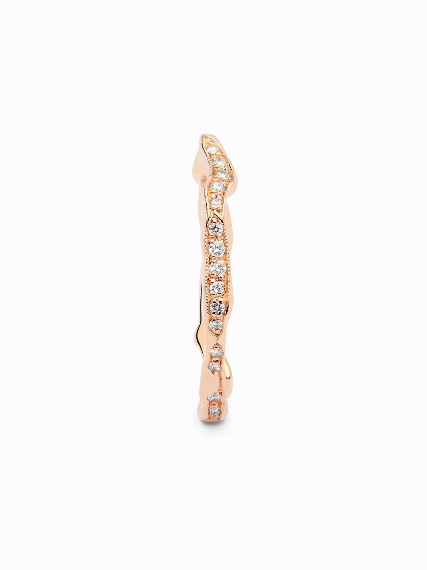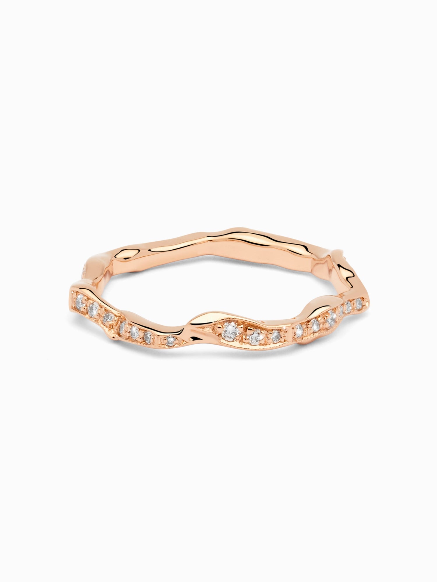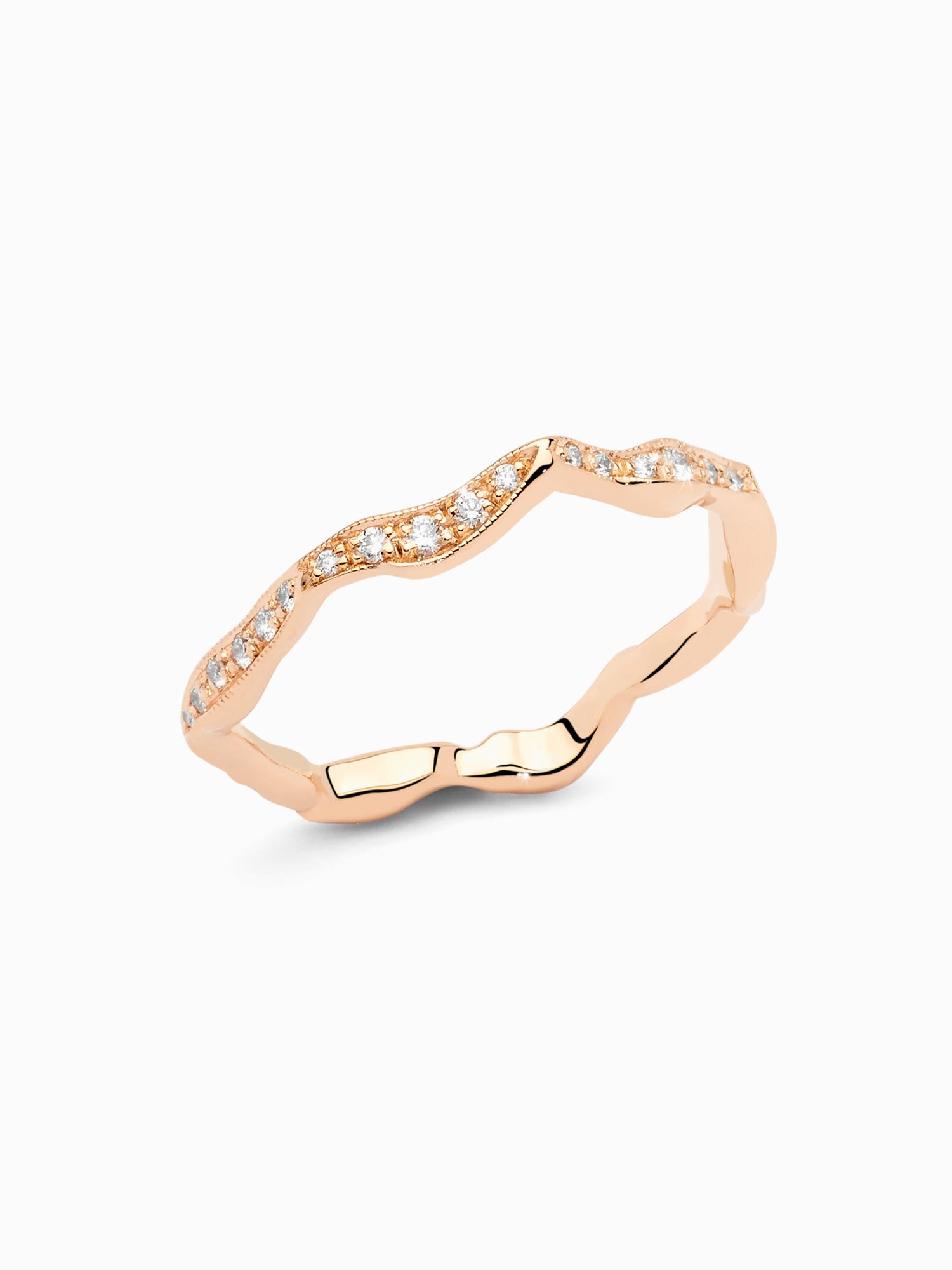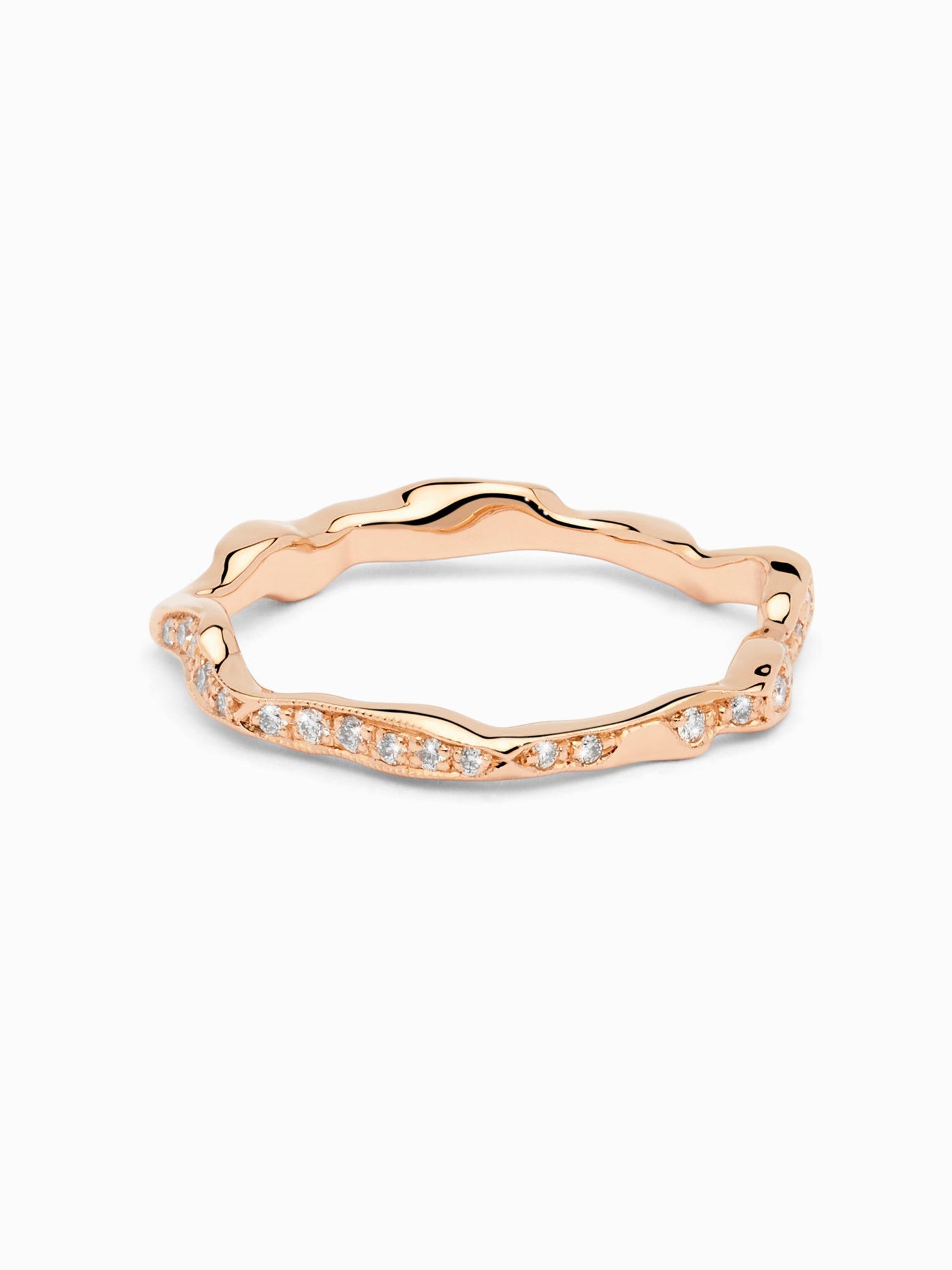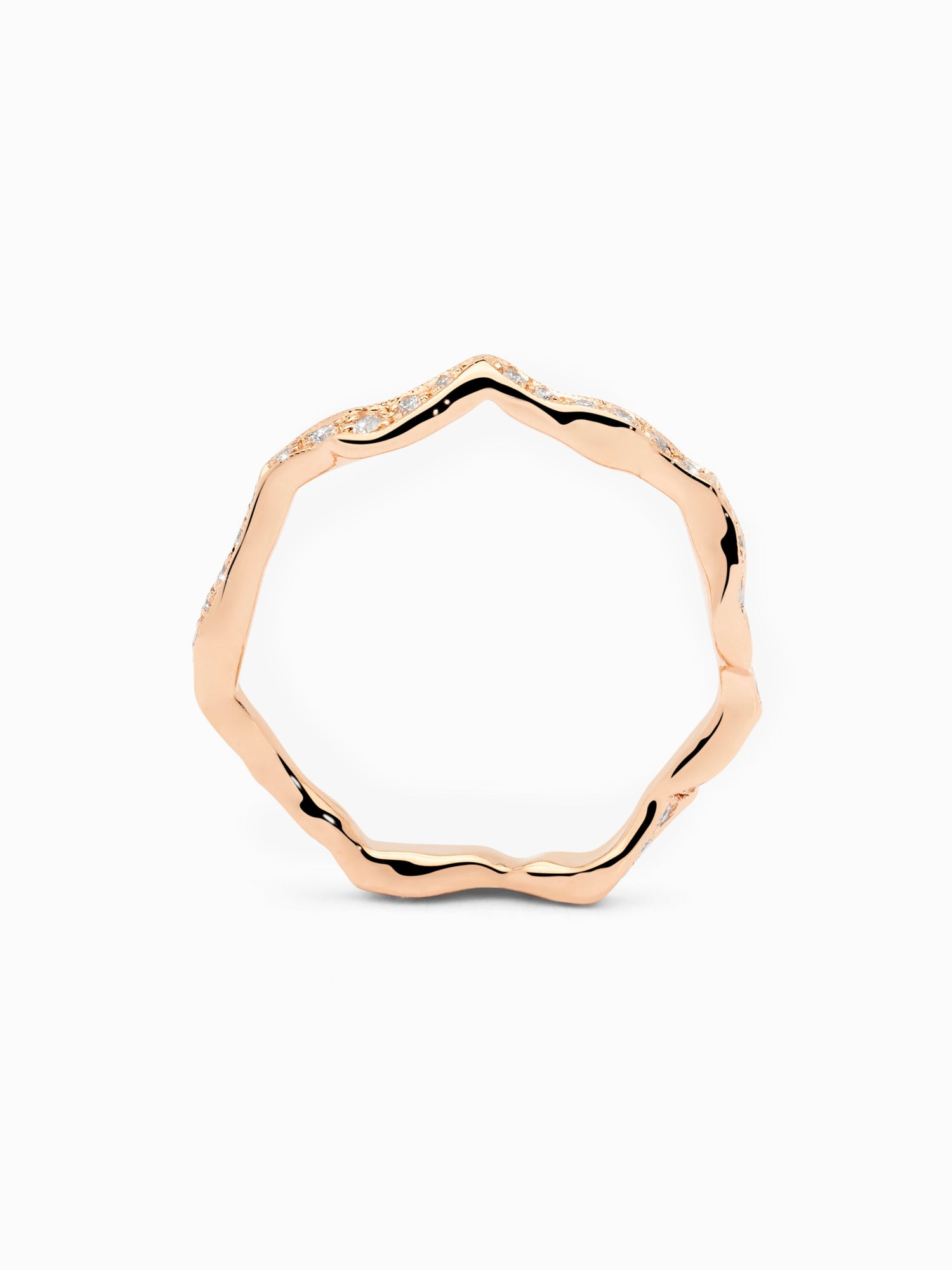 Se trata de un anillo de formas orgánicas e irregulares, pensado para que puedas personalizarlo a voluntad. Aquí puedes verlo con 7 bandas de diamantes trabajadas con una técnica decorativa llamada grafilato.