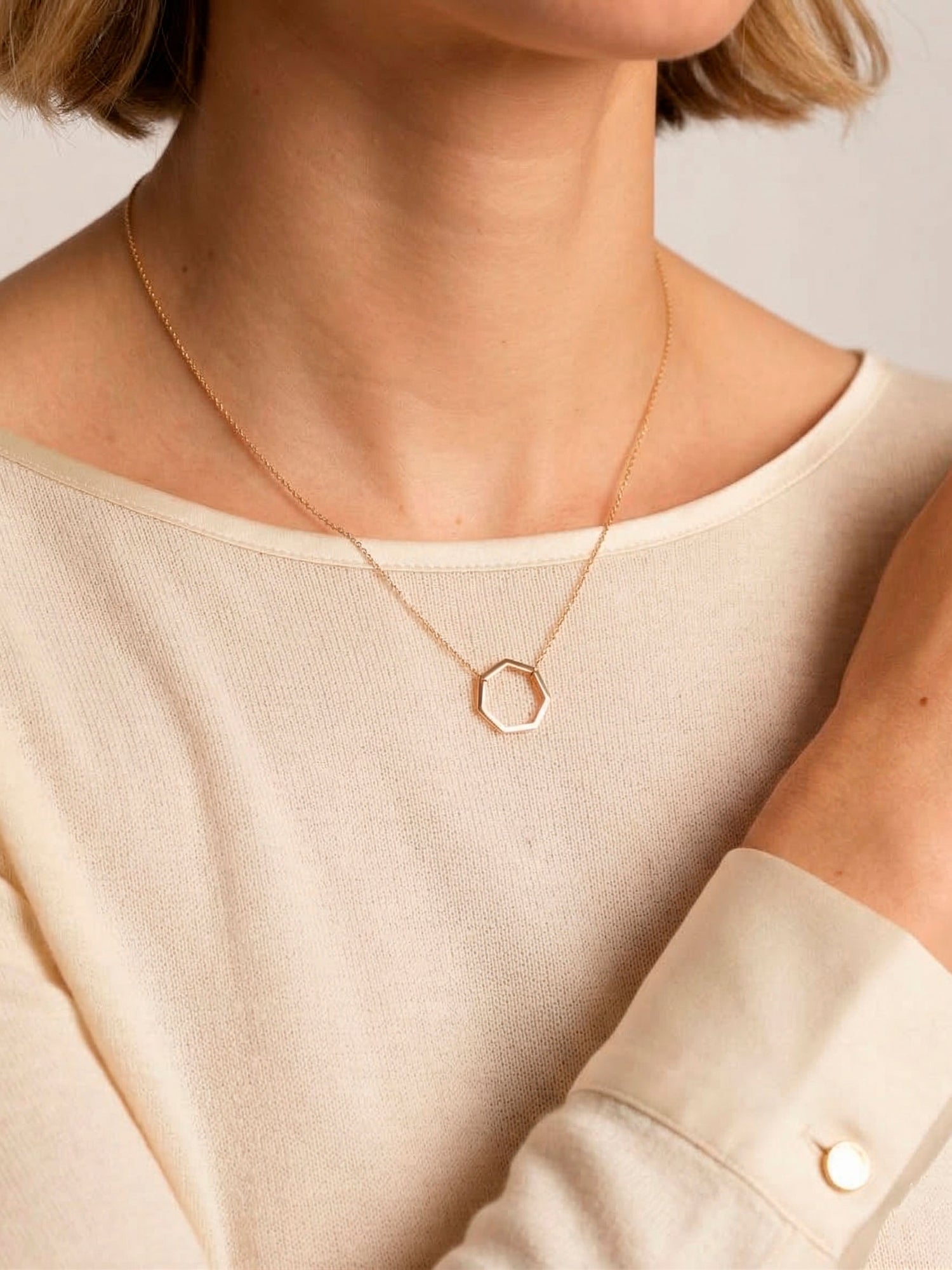 El motivo Heptágono es el icono corporativo de la marca de joyería de autor Roosik&Co. En la colección Heptasik, Jordi Rosich -diseñador y autor de las joyas de Roosik&Co.- ha hecho del motivo Heptágono el eje central de la colección. En este colgante, Rosich ha planteado el Heptagon a la inversa, al sujetarlo, de forma muy original, desde dos de sus vértices. Esta decisión convierte a este colgante en un complemento muy especial y un punto atrevido, que encajará perfectamente con una mujer contemporánea. El colgante de oro amarillo con motivo Heptágono de 16 mm. se trabaja en oro blanco y rosa.