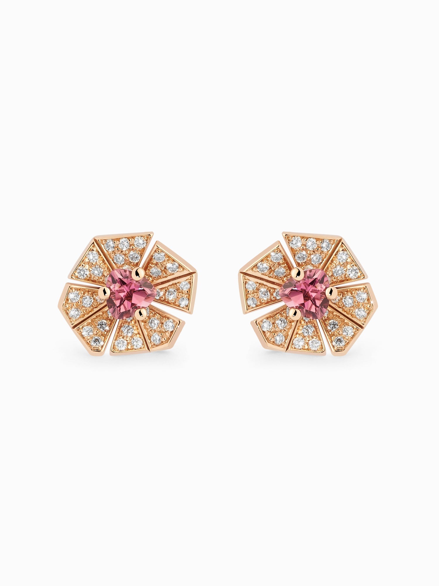 Jordi Rosich se ha inspirado en la intensidad de emociones de la primavera para crear estos pendientes en forma de flor donde el color rosa es el absoluto protagonista. Una fabulosa turmalina en talla trillón luce en el centro, rodeada de 7 brillantes pétalos que contrastan y le dan luz, como si fueran las gotas de rocío a primera hora de la mañana.