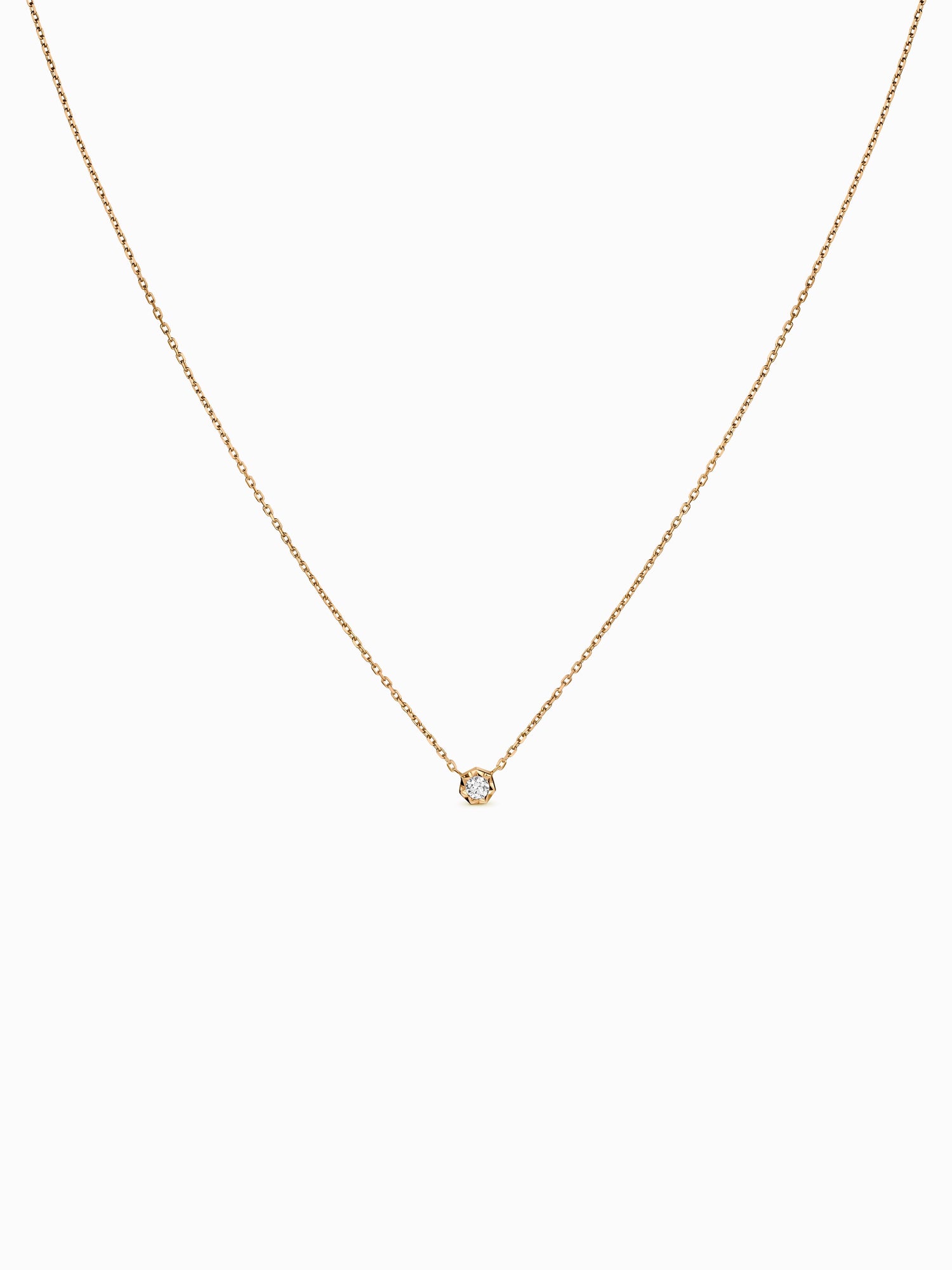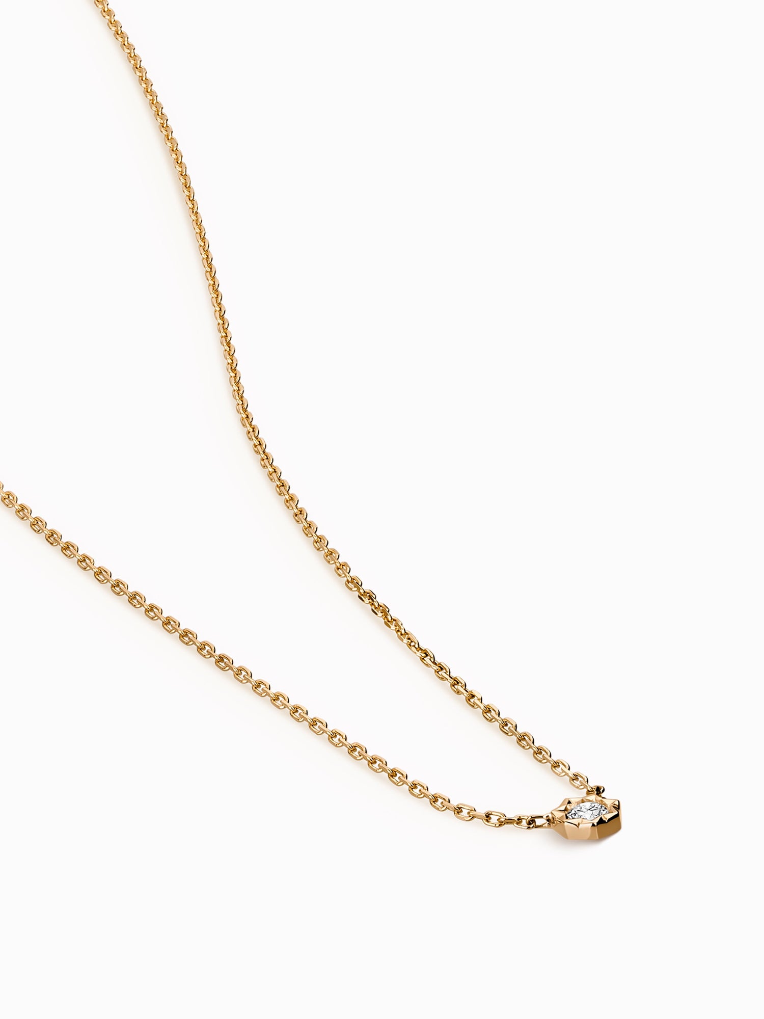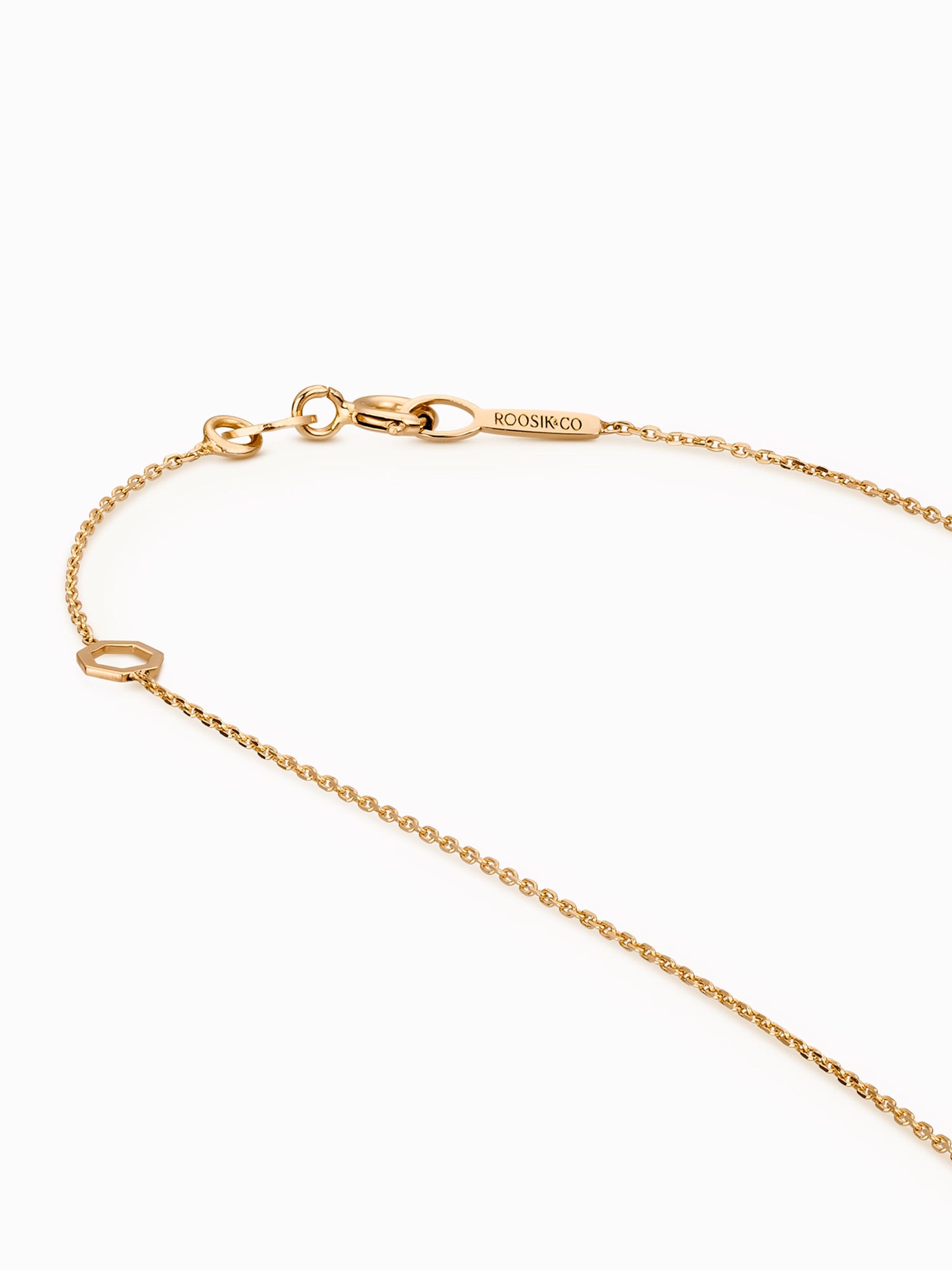 El motivo Heptágono es el icono corporativo de la marca de joyería de autor Roosik&Co. En la colección Heptasik, Jordi Rosich -diseñador y autor de las joyas de Roosik&Co.- ha hecho del motivo Heptágono el eje central de la colección. En este caso, el heptágono envuelve un diamante de 0,06ct, color E, grado de pureza VVS1, decisión que convierte este colgante en un complemento muy especial que encajará perfectamente con una mujer contemporánea. El colgante con motivo Heptágono y diamante se trabaja en oro amarillo, rosa y blanco.