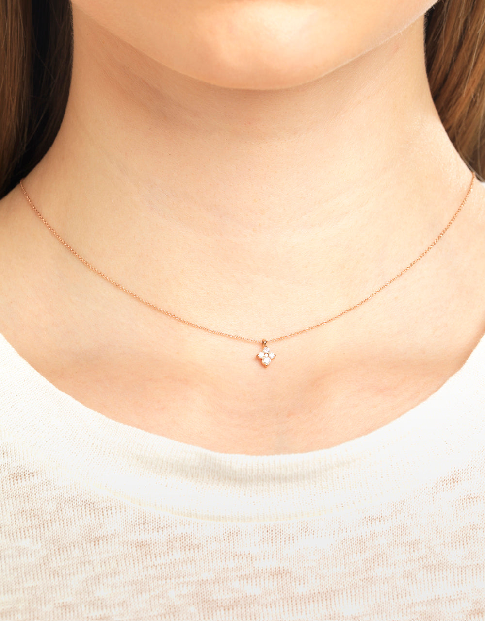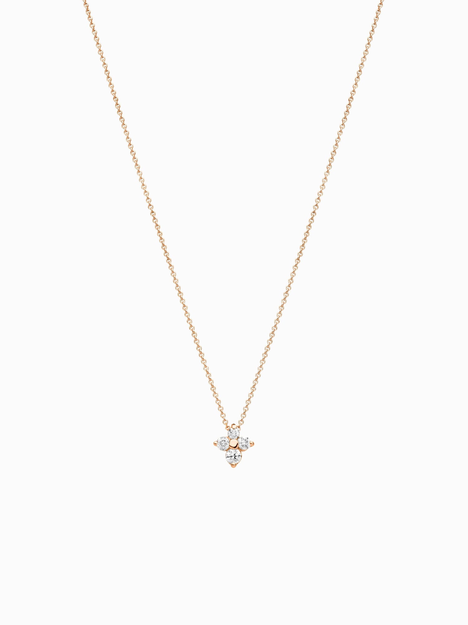 Cuatro diamantes, uno de ellos mayor que los demás, componen esta figura que evoca las hojas abiertas de un lirio. La simplicidad de la concepción en el diseño de este motivo contrasta con el efecto que crea, que hace pensar en la exuberancia de las flores más llamativas. En esta ocasión, Roosik & Co. lo plantea como colgante, por lo que el motivo adquiere una centralidad total en el escote. La serie Lilium se completa con otras piezas que se pueden combinar - pendientes, anillo, brazalete-, creando un conjunto de gran personalidad y atractivo.