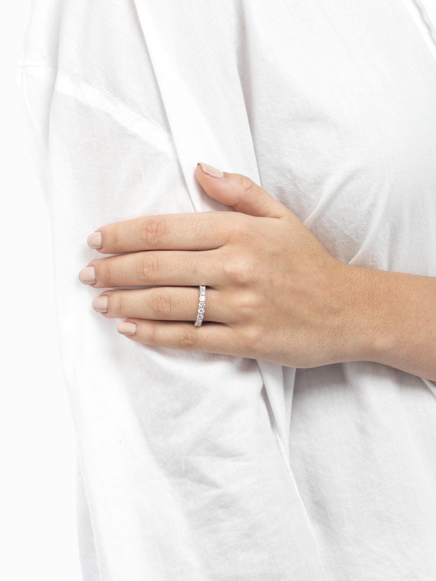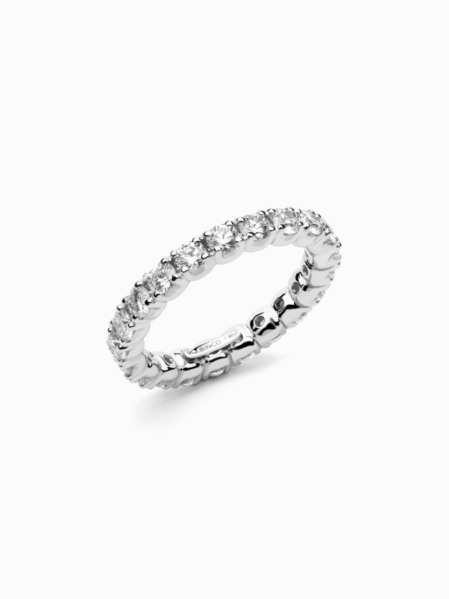 En este anillo de oro blanco, la protagonista absoluta es la sucesión de los 19 - 20 diamantes de 2,85 quilates (peso total). La armonía entre el color del oro blanco y la luz de los diamantes -la triple excelencia de las piedras garantiza la reflexión del 99% de la luz- componen un conjunto que acaba destacando por la elegancia final. Una joya perfecta para expresar los sentimientos más profundos.
