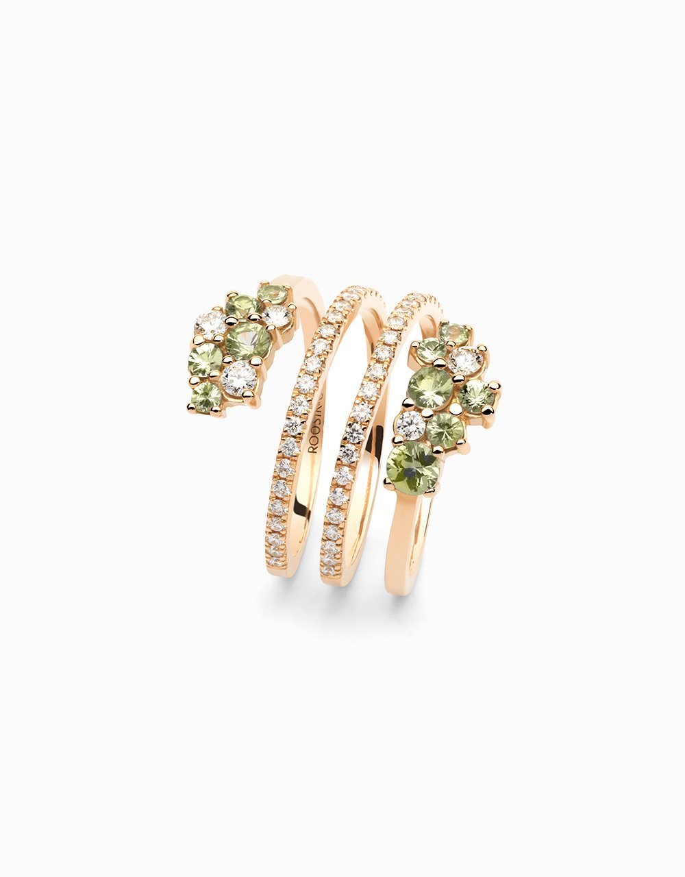 La doble espiral de este anillo, que Jordi Rosich ha trabajado en oro rosa, sostiene una sarta de diamantes infinitos, como la luz del sol infinita cuando penetra en la frondosidad del bosque. Los zafiros verdes ponen la nota de color a esta joya que, pese a la sutileza que le da la combinación de tonalidades, no deja de deslumbrar. La franqueza de las piedras naturales, la pureza de las formas geométricas y el toque selvático de los colgantes en ambos extremos del anillo hacen de esta joya un diseño que reúne al mismo tiempo esplendor y delicadeza.