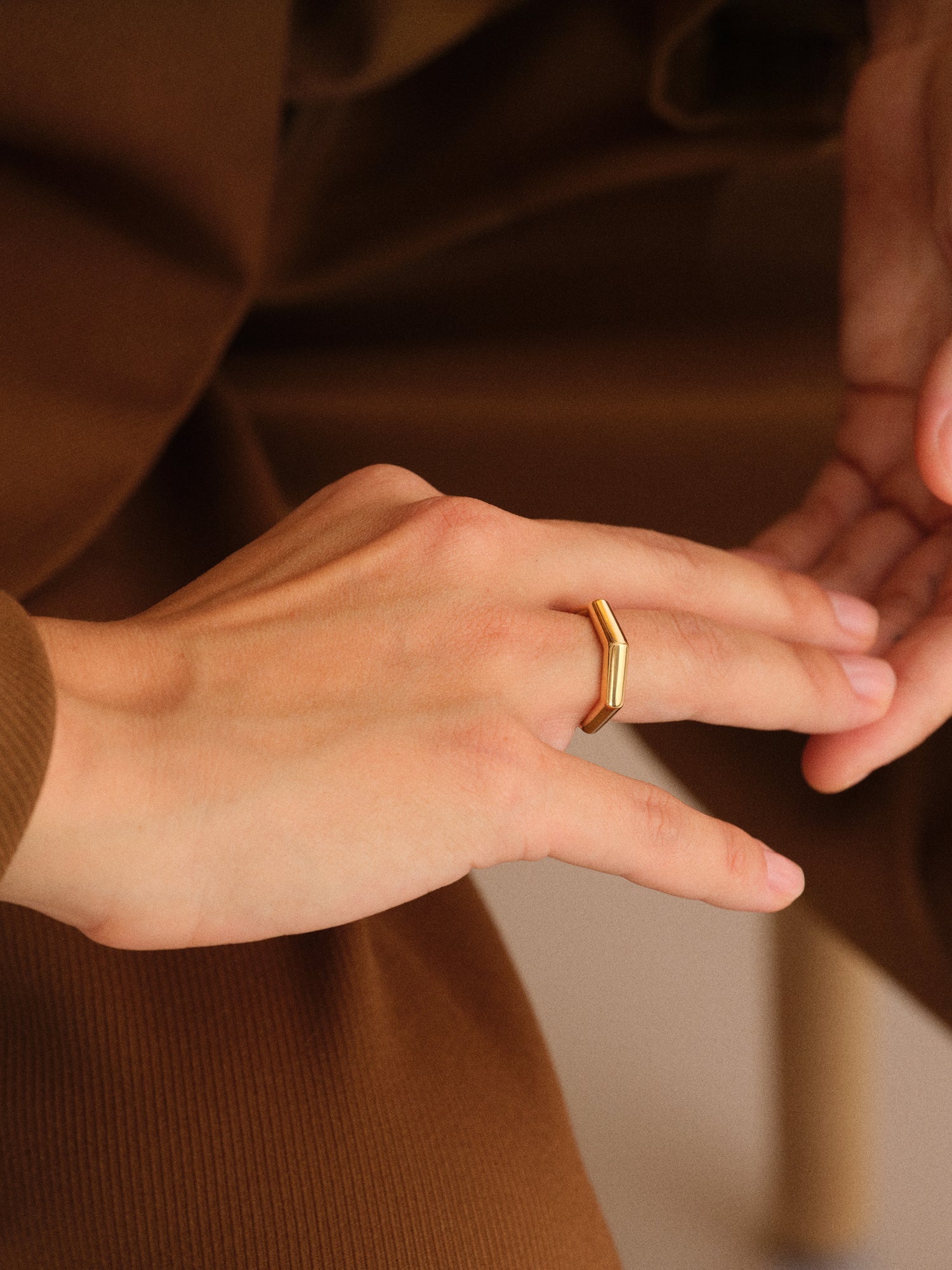 El heptágono luce esplendoroso en oro amarillo de 18k y un diseño contemporáneo y magnético, fíjate en él, es capaz de reflejar rayos como un pequeño Sol. Es una prenda con presencia y refinada pero a la vez muy portable.