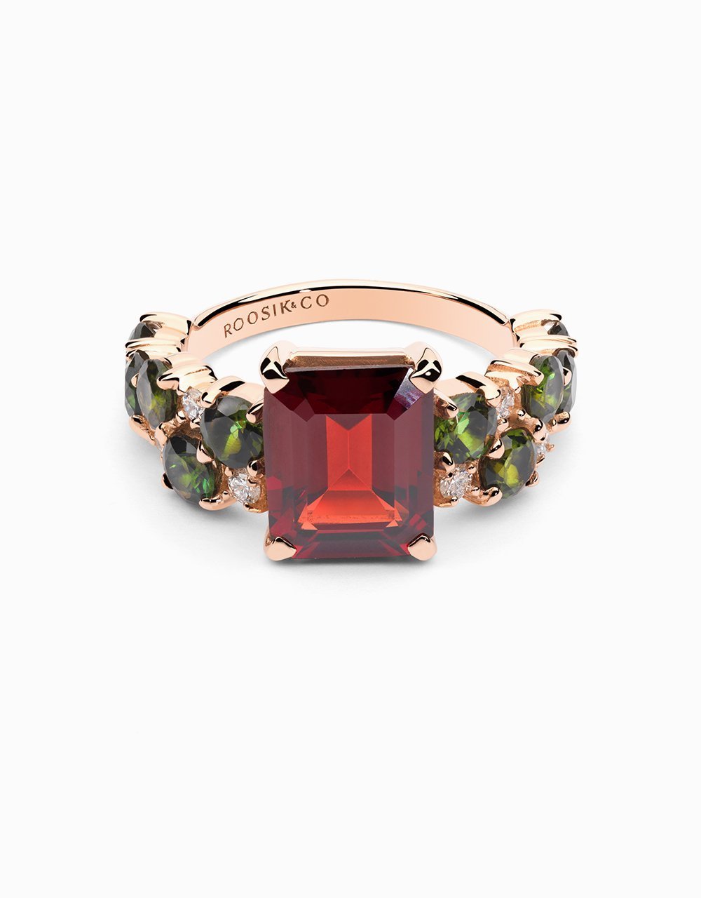 El anillo Blossom Verse es una de las propuestas más especiales de la colección Blossom de Roosik&Co. El rasgo distintivo de esta pieza tan original es el corte esmeralda de la gema protagonista: el granate. Las líneas rectas contrastan elegantemente con la sinuosidad de las turmalinas verdes y diamantes que le acompañan a ambos lados. Este contraste de formas junto con el juego de colores hacen de esta joya un complemento muy actual. Disponible con diferentes gemas naturales, el anillo Blossom Verse es una joya atrevida y sofisticada que sin duda no deja indiferente.