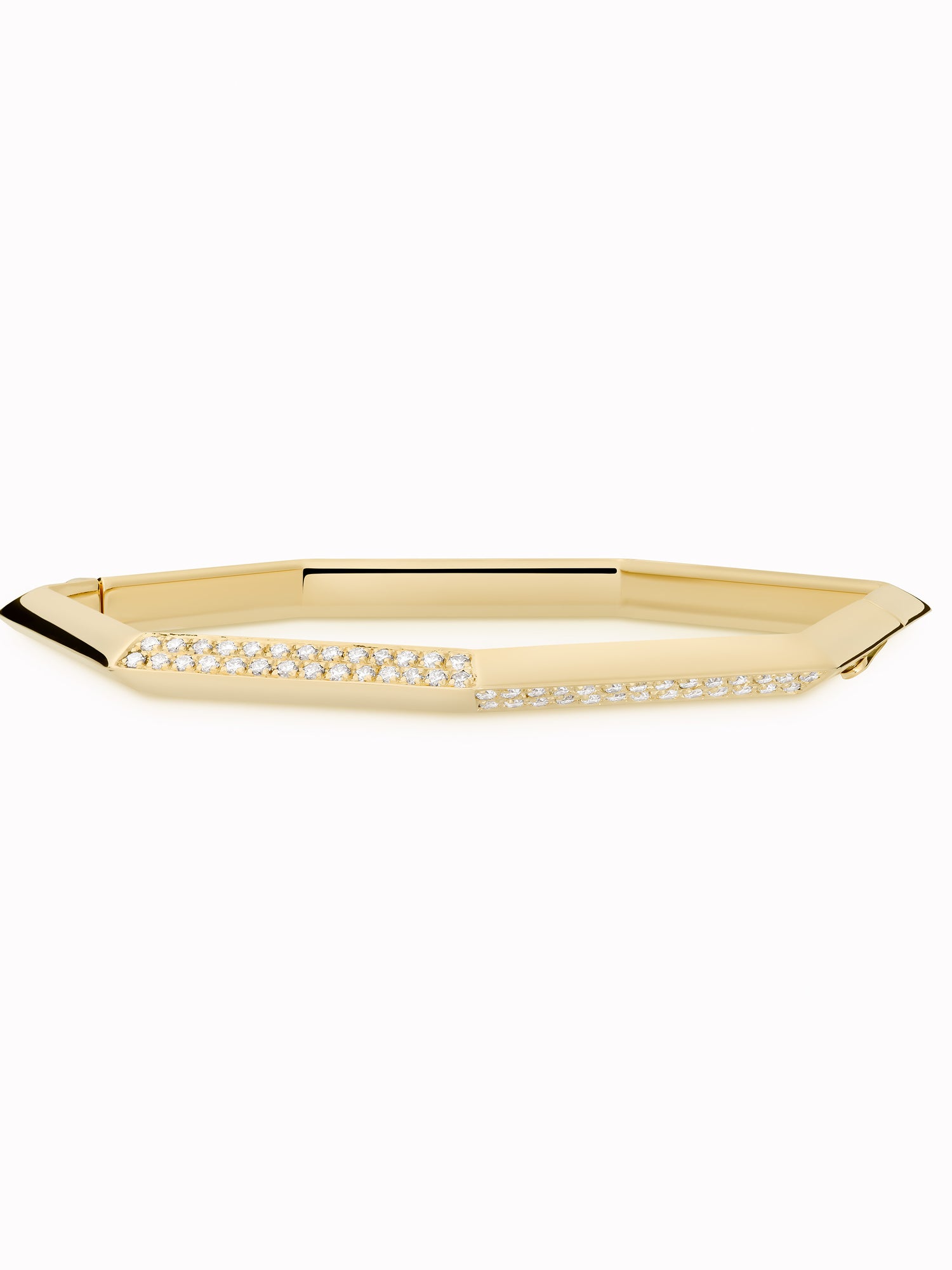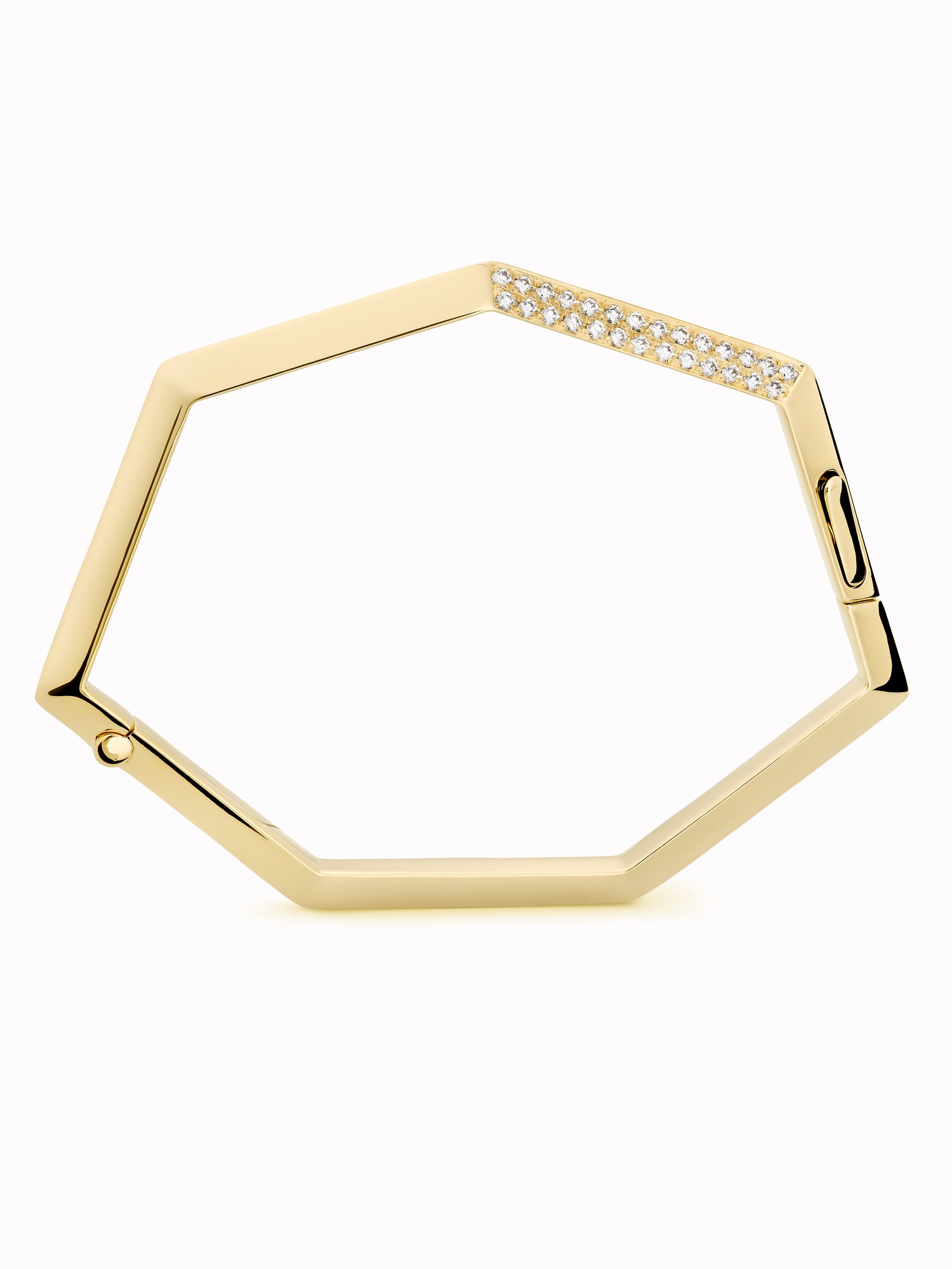 Una polsera rígida d'or geomètrica i sofisticada, inspirada en l’heptàgon icònic de Roosik&Co. L’or de 18k i els diamants naturals aporten llum i contrast a una peça potent, refinada i profundament contemporània.