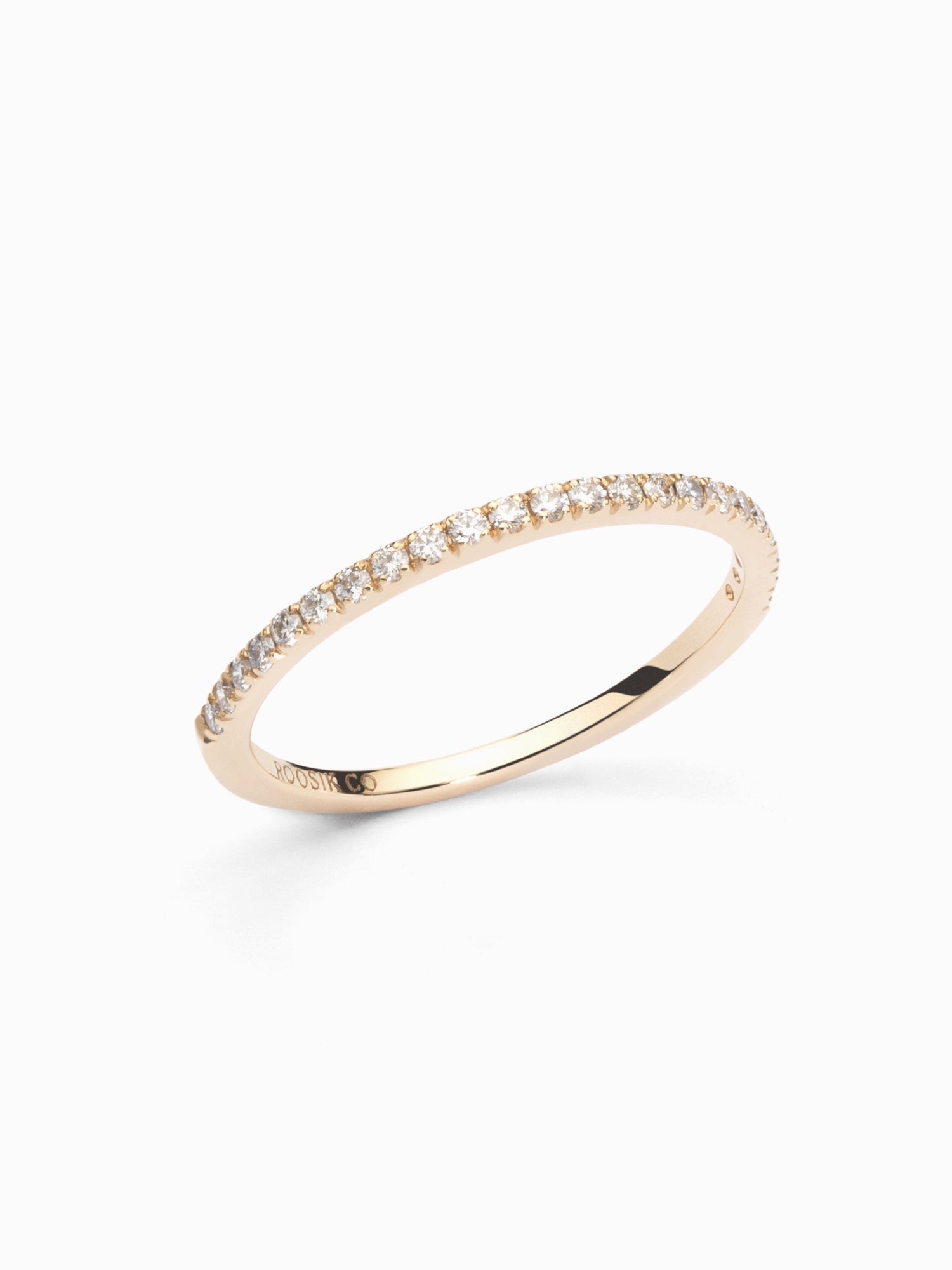 Una successió de 25 diamants que sumen 0,18 quirats fan d’aquest anell de la col·lecció Eternal de Roosik & Co una peça que és discreta però molt rica. L’harmonia entre el color de l’or rosa, la llum dels diamants -la triple excel·lència de les pedres garanteix la reflexió del 99% de la llum- i la cadència amb què es disposen les pedres sobre la part superior de l’anell composen un conjunt que acaba destacant per l’elegància final. Una joia perfecta per a expressar els sentiments més profunds.