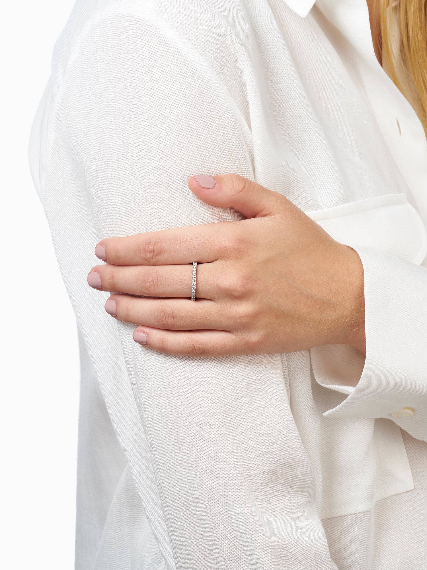 Una successió de 16 diamants fan d’aquest anell de la col·lecció Eternal de Roosik & Co una peça idònia per compromís o casament. L’harmonia entre el color de l’or blanc, la llum dels diamants -la triple excel·lència de les pedres garanteix la reflexió del 99% de la llum- i la cadència amb què es disposen les pedres sobre la part superior de l’anell composen un conjunt que acaba destacant per l’elegància final. Una joia perfecta per a expressar els sentiments més profunds.