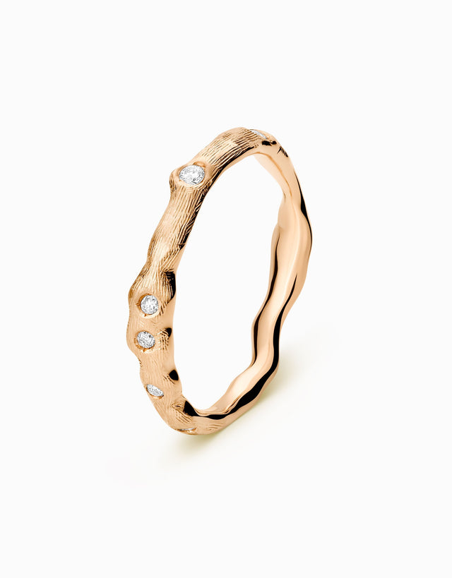 Aquest anell destaca per les formes irregulars i orgàniques que evoquen la tija d'una flor o la branqueta d'un arbre. Però a diferència de la resta de peces de la col·lecció, aquí es presenta amb un acabat mate gràcies a les linies gravades a mà amb la tècnica del buril. D'aquesta manera es potencia encara més la sensació de trobar-nos davant d'una joia que fa un homenatge a la natura.