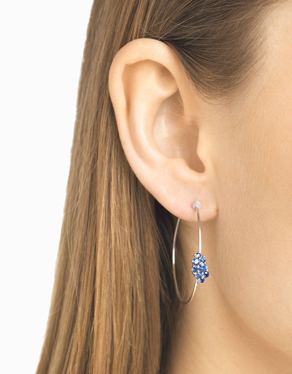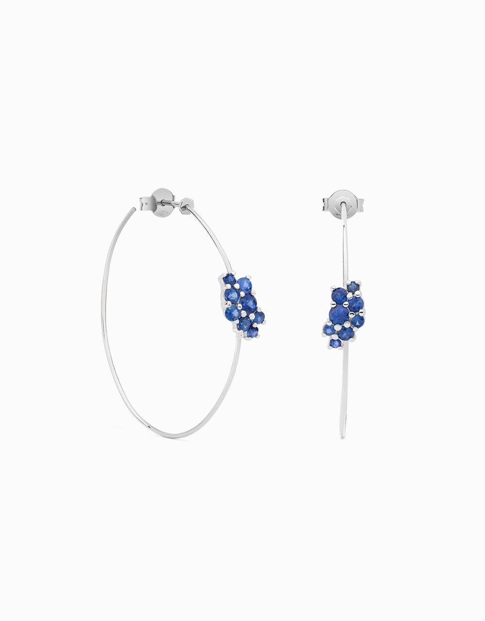 Una de les joies més divertides i ocurrents de Jordi Rosich per a la sèrie Bunch de la col·lecció Blossom de Roosik&Co. Les clàssiques criolles es presenten en or blanc, el punt d’atreviment és l’aplicació del motiu protagonista de la sèrie Bunch, el penjoll de safirs, en aquest cas en color blau. Un complement d’una enorme modernitat, per a dones d’esperit juvenil i desenfadat. Unes arracades molt fàcils de portar gràcies a la tanca posterior que incorporen, que combinen perfectament amb looks frescos.